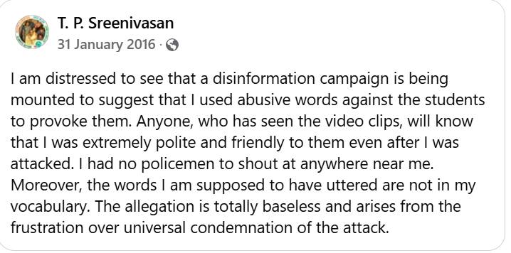 "വിദ്യാർത്ഥികളെ പ്രകോപിപ്പിക്കാൻ ഞാൻ അവരെ അധിക്ഷേപകരമായ വാക്കുകൾ ഉപയോഗിച്ചുവെന്ന് സൂചിപ്പിക്കുന്ന ഒരു തെറ്റായ പ്രചാരണം നടക്കുന്നത് കാണുന്നതിൽ എനിക്ക് വിഷമമുണ്ട്. ആക്രമണത്തിന് ശേഷവും ഞാൻ അവരോട് അങ്ങേയറ്റം മര്യാദയും സൗഹൃദവുമായിരുന്നുവെന്ന് വീഡിയോ ക്ലിപ്പുകൾ കാണുന്ന ആർക്കും മനസ്സിലാകും. എനിക്ക് അടുത്തെങ്ങും ഒച്ചവെക്കാൻ പോലീസുകാരില്ലായിരുന്നു. മാത്രമല്ല, ഞാൻ പറഞ്ഞതായി കരുതപ്പെടുന്ന വാക്കുകൾ എൻ്റെ പദാവലിയിലില്ല. ആരോപണം തീർത്തും അടിസ്ഥാനരഹിതമാണ്, ആക്രമണത്തെ സാർവത്രികമായി അപലപിച്ചതിലുള്ള നിരാശയിൽ നിന്നാണ് ഇത് ഉടലെടുത്തത്."