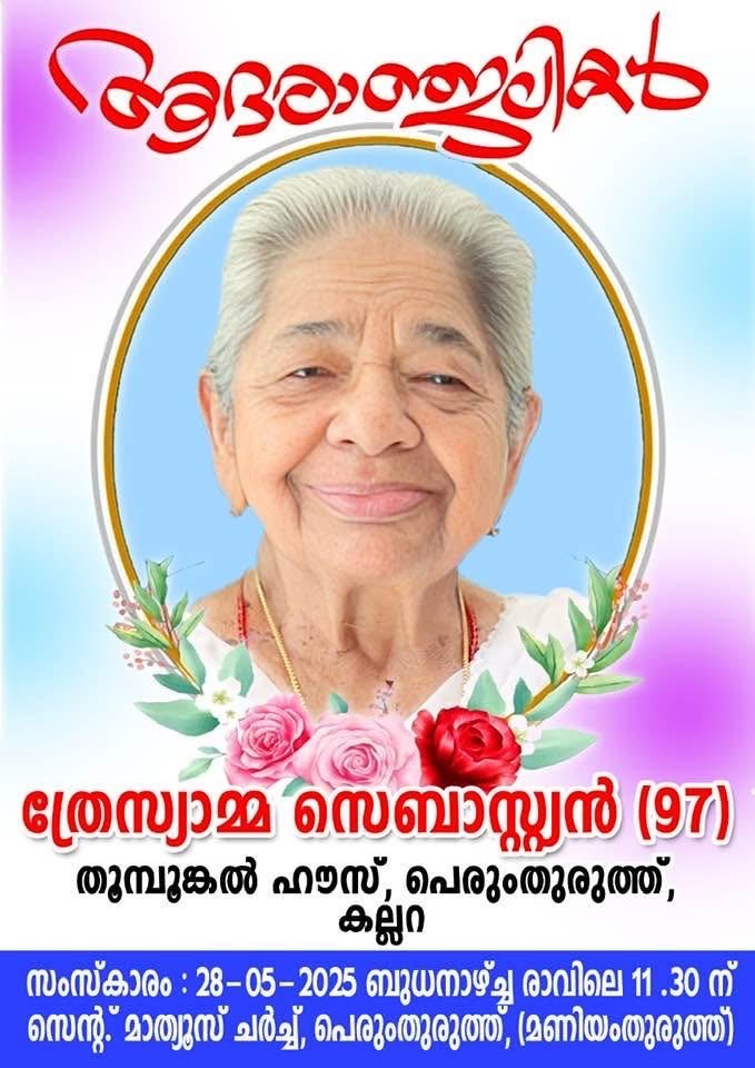 KALLARA :Thresiamma Sebastian W/O Late Joseph Sebastian, Thoompunkal, Perumthuruthu, Kallara passed away in Kerala. She is the mother of Mohan Sebastian (Santhy) ,Chicago.