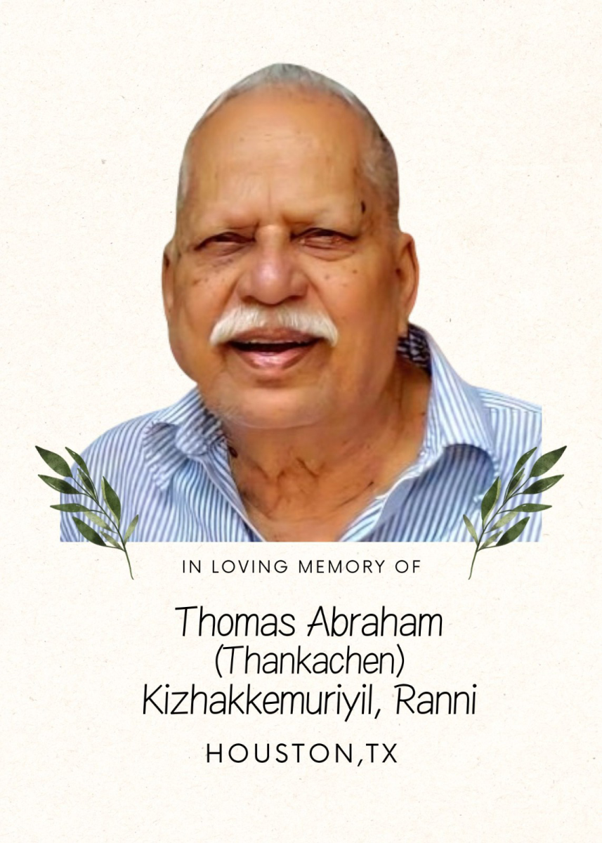 ഹൂസ്റ്റൺ: റാന്നി ഐത്തല കിഴക്കേമുറിയിൽ തോമസ് എബ്രഹാം (തങ്കച്ചൻ) ഹൂസ്റ്റണിൽ നിര്യാതനായി. പരേതന്റെ ഭാര്യ മറിയാമ്മ കല്ലിശ്ശേരി