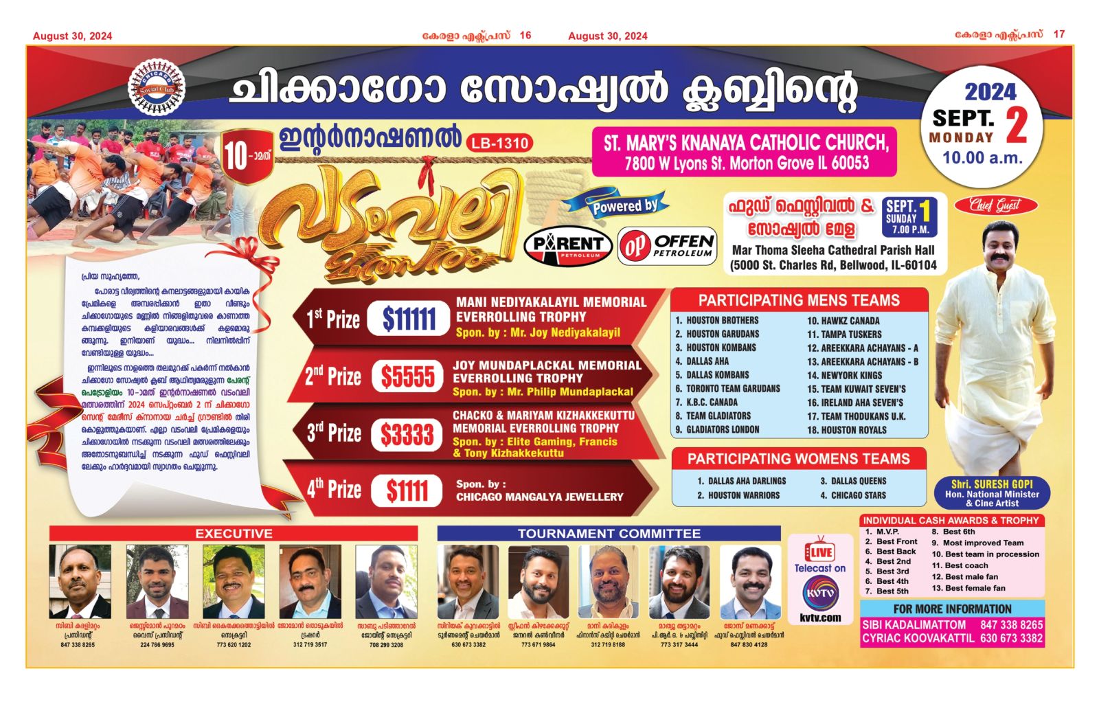 ചിക്കാഗോ : 2024 സെപ്റ്റംബര് 2 തിങ്കളാഴ്ച രാവിലെ 11 മണി മുതല് ചിക്കാഗോ സെന്റ് മേരീസ് ക്നാനായ പള്ളി മൈതാനിയില് ആരംഭിക്കുന്ന വടംവലി മത്സരം കേന്ദ്രമന്ത്രി സുരേഷ് ഗോപി ഉത്ഘാടനം ചെയ്യുമെന്ന് പ്രസിഡന്റ് സിബി കദളിമറ്റവും ടൂർണമെന്റ് ചെയര്മാന് സിറിയക് കൂവക്കാട്ടിലും, വൈസ് പ്രസിഡന്റ് ജെസ്സ്മോൻ പുറമഠത്തില്, സെക്രട്ടറി സിബി കൈതക്കത്തൊട്ടിയില് ട്രഷറര് ജോമോന് തൊടുകയില്, ജോയിന്റ് സെക്രട്ടറി സാബു പടിഞ്ഞാറേല്, ജനറല് കണ്വീനര് സ്റ്റീഫന് കിഴക്കേക്കുറ്റ്, ഫൈനാന്സ് കമ്മിറ്റി ചെയര്മാന് മാനി കരികുളം, പി.ആര്.ഒ. മാത്യു തട്ടാമറ്റം, ഫുഡ് ഫെസ്റ്റിവല് ചെയര്മാന് ജോസ് മണക്കാട്ട് എന്നിവര് സംയുക്തമായി വാര്ത്താക്കുറിപ്പില് അറിയിച്ചു. ഈ വര്ഷം കുവൈറ്റ്, ലണ്ടന്, കാനഡ, എന്നീ രാജ്യങ്ങളില് നിന്നും നോര്ത്ത് അമേരിക്കയിലെ ഇതര സംസ്ഥാനങ്ങളായ താമ്പാ, ഹ്യൂസ്റ്റണ്, ന്യൂയോര്ക്ക് എന്നിവിടങ്ങളില് നിന്നുള്ള ടീമുകളും, ചിക്കാഗോയിലെ കരുത്തന്മാരായ ടീമുകളും കൂടാതെ അയര്ലന്റില് നിന്നുള്ള ടീം കൂടി പങ്കെടുക്കുന്നത് ഇത്തവണത്തെ മത്സരത്തിന് മാറ്റു കൂട്ടുന്നു. ഏതാണ്ട് 16 ടീമുകള് മാറ്റുരയ്ക്കുന്നതോടു കൂടി ചിക്കാഗോ സോഷ്യല് ക്ലബ്ബിന്റെ ഈ വര്ഷത്തെ അന്താരാഷ്ട്ര വടംവലി മത്സരത്തിന് നോര്ത്ത് അമേരിക്കന് മലയാളി കായിക ചരിത്രത്തില് പുതിയൊരദ്ധ്യായം കൂടി കുറിക്കുന്നു.