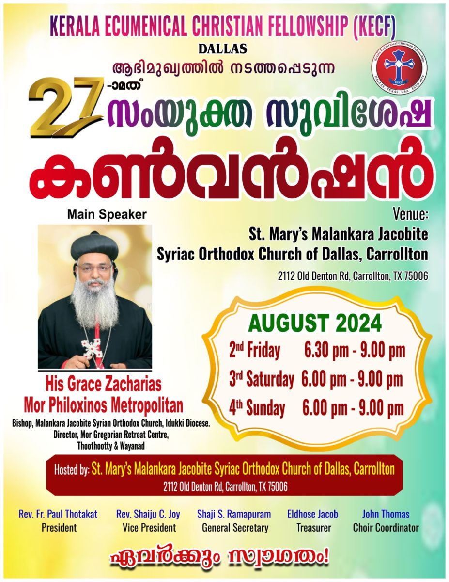 ഡാളസ്: കേരള എക്യുമെനിക്കല് ഫെലോഷിപ്പിന്റെ (KECF) ആഭിമുഖ്യത്തില് ഇരുപത്തിഏഴാംമത് സംയുക്ത സുവിശേഷ കണ്വെന്ഷന് ഓഗസ്റ്റ് 2 വെള്ളി മുതല് 4 ഞായര് വരെ ഡാളസിലെ കരോൾട്ടണിലുള്ള സെന്റ് മേരീസ് മലങ്കര യാക്കോബായ സിറിയൻ ഓര്ത്തഡോക്സ് ദേവാലയത്തിൽ വെച്ച് (2112, Old Denton Rd, Carrollton, TX 75006) നടത്തപ്പെടുന്നു.