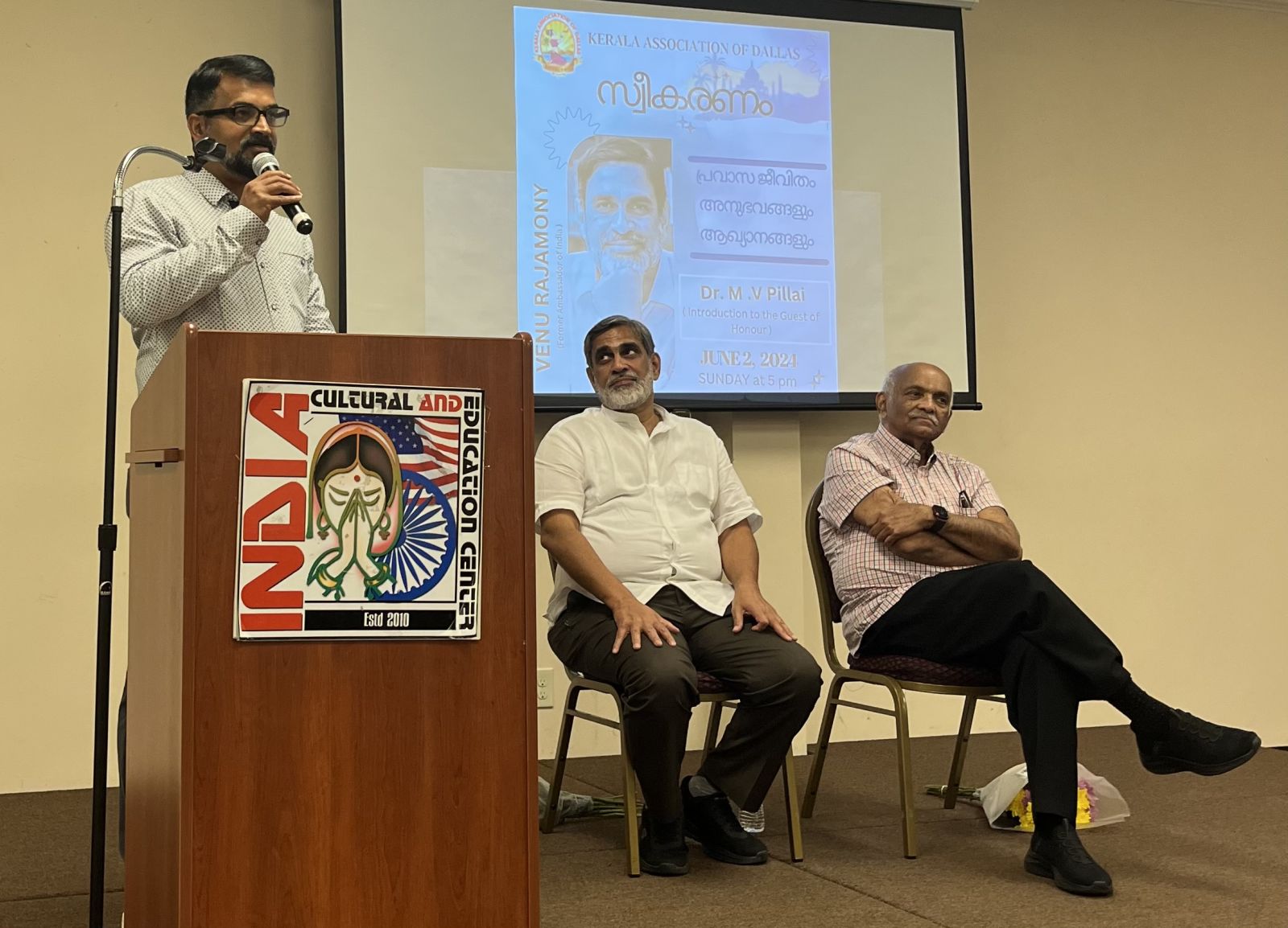ഡാളസ് :കേരള അസോസിയേഷൻ ഓഫ് ഡാളസിൻ്റെ ആഭിമുഖ്യത്തിൽ ബഹു. വേണു രാജാമണിക്കു ജൂൺ 2 ഞായറാഴ്ച വൈകുന്നേര ഇന്ത്യ കൾച്ചറൽ & എഡ്യൂക്കേഷൻ സെൻ്റർ ഓഡിറ്റോറിയത്തിൽ വെച്ചു ഊഷ്മള സ്വീകരണം നൽകി.കേരള അസോസിയേഷൻ ഡയറക്ടര്മാരായ സുബിൻ ഫിലിപ്പ്,.നിഷ മാത്യു എന്നിവർ അതിഥികൾക്കു പൂച്ചെണ്ടുകൾ നൽകി വേദിയിൽ സ്വീകരിച്ചു.