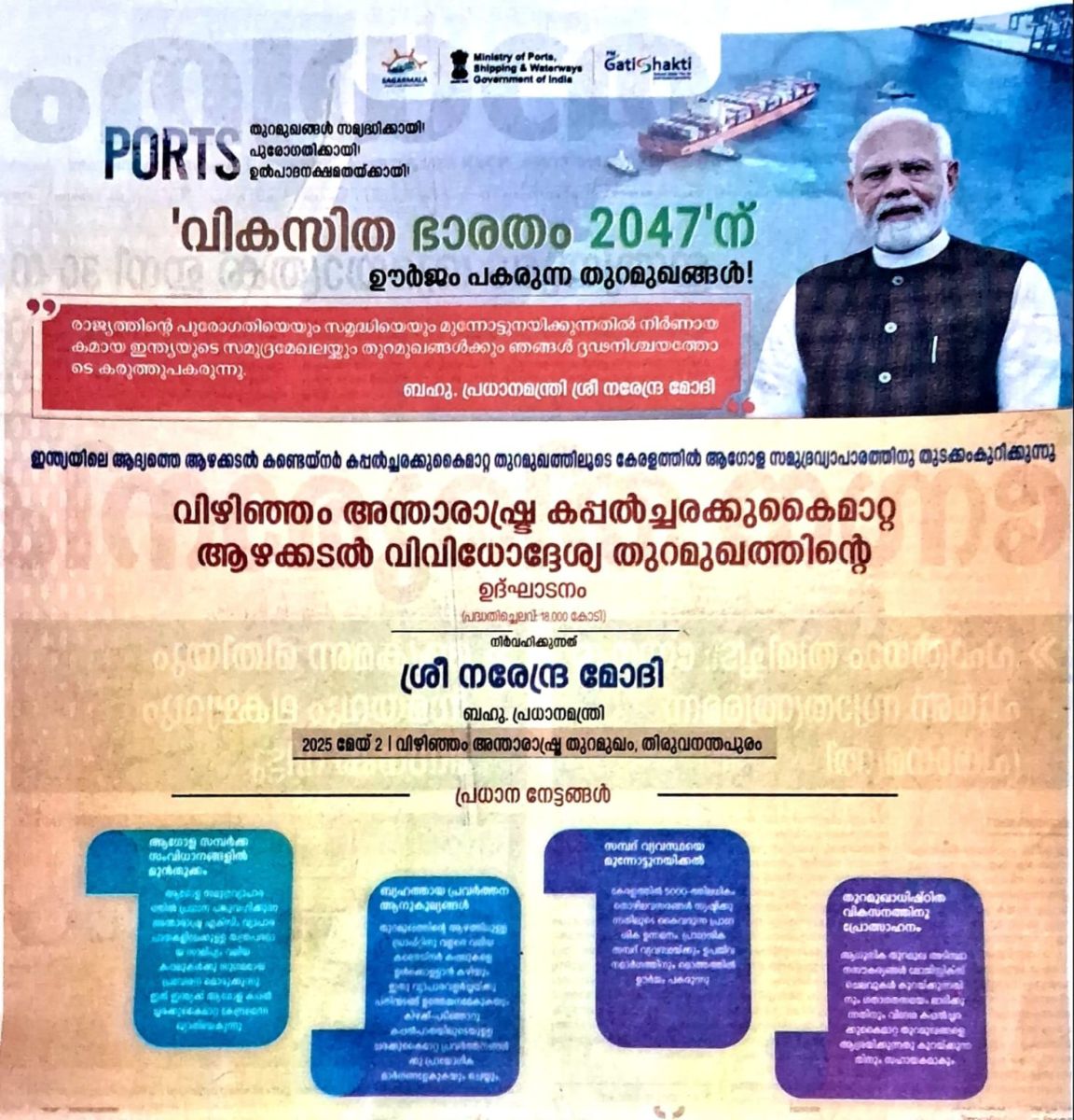 വികസിത് ഭാരത് 2047ന്റെ ഭാഗമായാണ് പദ്ധതിയെന്ന് ഷിപ്പിങ് മന്ത്രാലയം നല്കിയ പരസ്യത്തില് പറയുന്നുണ്ട്. ഉദ്ഘാടന ചടങ്ങില് പങ്കെടുക്കാന് പ്രധാനമന്ത്രി നാളെ തിരുവനന്തപുരത്തെത്തും. വെള്ളിയാഴ്ച നടക്കുന്ന തുറമുഖ കമ്മിഷനിങ്ങിനാണ് അദ്ദേഹമെത്തുന്നത്. വ്യാഴാഴ്ച വൈകിട്ട് ഏഴരയോടെ വിമാനത്താവളത്തിലെത്തുന്ന പ്രധാനമന്ത്രി രാജ്ഭവനിലാണ് താമസിക്കുന്നത്. വെള്ളിയാഴ്ച രാവിലെ പത്തരയോടെയാണ് തുറമുഖത്ത് ചടങ്ങ്.