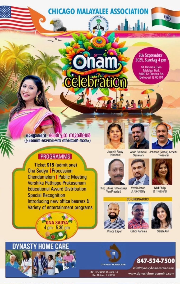 ഈ ഓണാഘോഷത്തിലേക്ക് എല്ലാ മലയാളി സുഹൃത്തുക്കളെയും സ്വാഗതം ചെയ്യുന്നതായി ചിക്കാഗോ മലയാളി അസോസിയേഷൻ പ്രസിഡന്റ് ജെസ്സി റിൻസി, സെക്രട്ടറി ആൽവിൻ ഷിക്കോർ ,ട്രെഷറർ മനോജ് അച്ചേട്ട് ,പി ആർ ഓ ശ്രീ :ബിജു മുണ്ടക്കൽ,ഫിലിപ്പ് പുത്തൻപുരയിൽ ,വിവിഷ് ജേക്കബ്, ഡോ :സിബിൽ ഫിലിപ്പ് ,കോ ഓർഡിനേറ്റർമാരായ പ്രിൻസ് ഈപ്പൻ,കിഷോർ കണ്ണാല,സാറ അനിൽ എന്നിവർ അറിയിച്ചു .