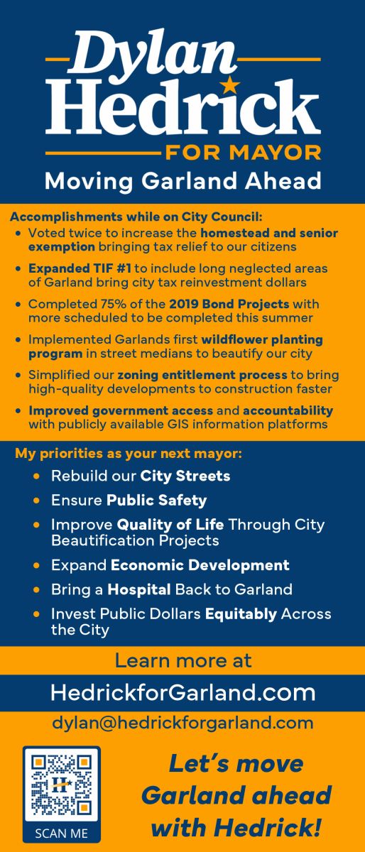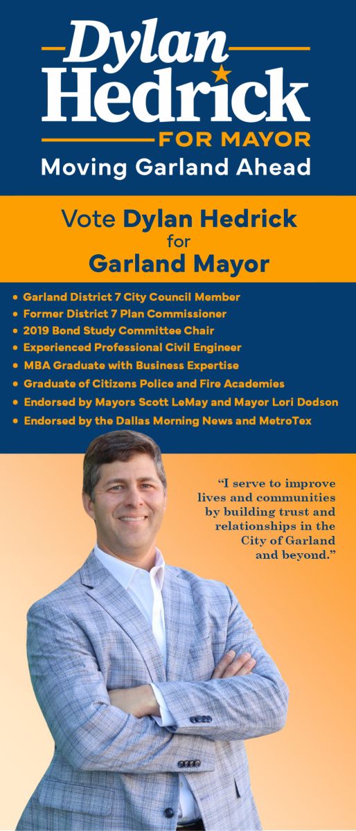 ഗാർലണ്ടിൽ വോട്ട് രജിസ്റ്റർ ചെയ്തിട്ടുള്ളവർ കടന്നു വന്നു ഡിലൻ ഹെഡറിക്കിന് വോട്ടു ചെയ്തു വിജയിപ്പിക്കണമെന്ന് ഡിലൻ ഹെഡ്രിക്ക് വിനീതമായി അഭ്യർത്ഥിച്ചു.