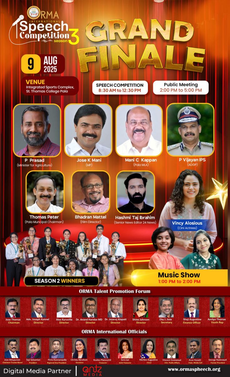 ഓര്മ്മ ഇന്റര്നാഷണല് (ഓവര്സീസ് റസിഡന്റ് മലയാളീസ് അസോസിയേഷന്) ടാലന്റ് പ്രൊമോഷന് ഫോറം സംഘടിപ്പിക്കുന്ന ഇന്റര്നാഷണല് പ്രസംഗമത്സരം സീസണ് 3 വിജയകരമായ മൂന്നു ഘട്ടങ്ങളും പൂര്ത്തിയാക്കി ഗ്രാന്ഡ് ഫിനാലേയിലേക്ക് കടക്കുന്നു. ആഗസ്റ്റ് 8, 9 തീയതികളില് പാലായിലെ സെന്റ് തോമസ് കോളേജ് ഇന്റഗ്രേറ്റഡ് സ്പോര്ട്സ് കോംപ്ലക്സ് ഓഡിറ്റോറിയത്തില് വെച്ചാണ് ഗ്രാന്ഡ് ഫിനാലെ നടക്കുന്നത്. കേരളത്തിന്റെ കൃഷി മന്ത്രിയും, വാഗ്മിയുമായ പി പ്രസാദ് ഗ്രാന്ഡ് ഫിനാലേ ഉദ്ഘാടനം ചെയ്യും.