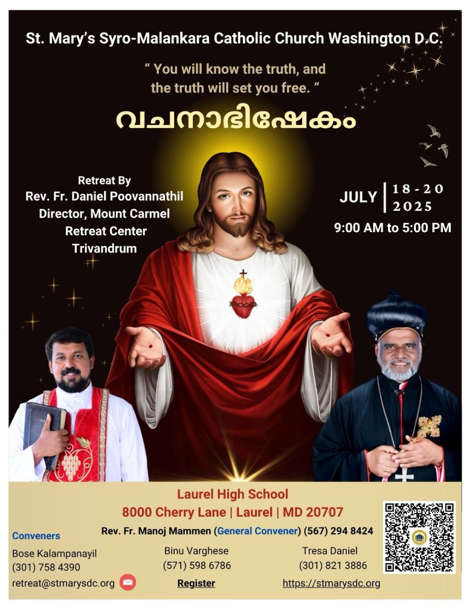 പ്രശസ്ത ആത്മീയ ധ്യാനഗുരുവും വചനപ്രഘോഷകനുമായ ഡാനിയേൽ പൂവണ്ണത്തിലച്ചൻ നയിക്കുന്ന വചനാഭിഷേക ധ്യാനത്തിന്റെ ഒരുക്കങ്ങൾ പൂർത്തിയായി . ജൂലൈ മാസം 18 മുതൽ 20 വരെ മെരിലാന്റിലെ ലോറൽ ഹൈസ്കൂളിൽവെച്ച് രാവിലെ 9 മുതൽ വൈകിട്ട് 5 വരെയാണ് ധ്യാനം ക്രമീകരിച്ചിരിക്കുന്നത്. കുട്ടികൾക്കായി പ്രത്യേക ധ്യാനം ക്രമീകരിച്ചിട്ടുണ്ട് .