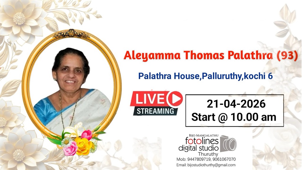 പള്ളുരുത്തി :ഞങ്ങളുടെ പ്രിയ മാതാവും പരേതനായ ഞങ്ങളുടെ പ്രിയ പിതാവ് പാലത്ര തോമസിന്റെ ഭാര്യ ഏലിയാമ്മ തോമസ് ( 93), ഏപ്രിൽ 16 ന് നിര്യാതയായ വിവരം വ്യസനപൂർവ്വം അറിയിക്കുന്നു.