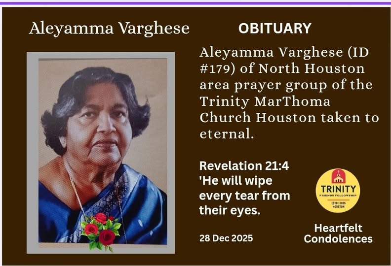 സംസ്കാര ശുശ്രൂഷകൾ 01/02/2026നു 8:30 AM ഹ്യൂസ്റ്റനിൽ: ട്രിനിറ്റി മാർത്തോമ്മാ ചർച്ചിൽ വച്ചായിരിക്കും. ബന്ധുമിത്രാദികൾ ഇതൊരു അറിയിപ്പായി സ്വീകരിക്കണമെന്ന് അപേക്ഷിക്കുന്നു.