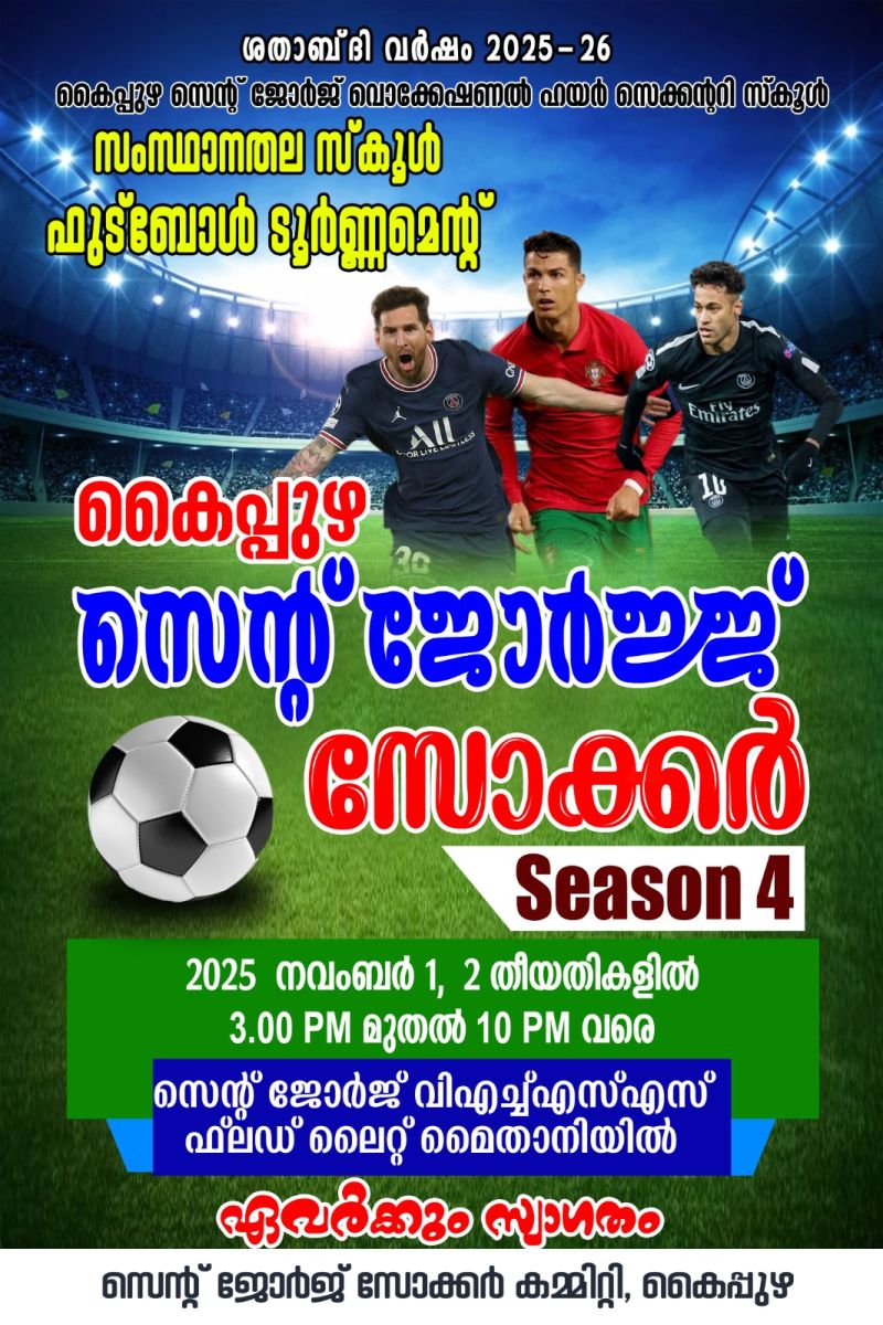 കൈപ്പുഴ: സെൻ്റ് ജോർജ് വി.എച്ച് .എസ് .എസിൽ ശതാബ്ദി ആഘോഷങ്ങളോടനുബന്ധിച്ച് അഖില കേരള സ്കൂൾ ഫുട്ബോൾ ടൂർണമെൻ്റ് (സെൻ്റ് ജോർജ് സോക്കർ സീസൺ - 4)നടക്കും.