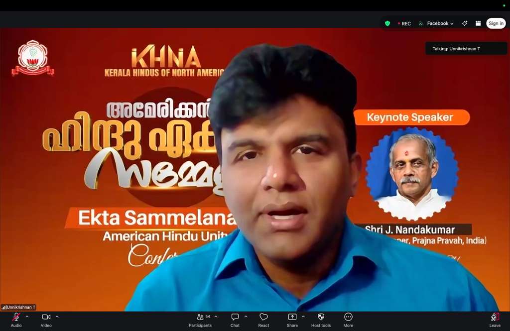 അമേരിക്കയുടെയും കാനഡയുടെയും വിവിധ ഭാഗങ്ങളിൽ നിന്നായി സമ്മേളനത്തിൽ പങ്കെടുത്ത സംഘടനാ നേതാക്കളെയും പ്രവർത്തകരെയും KHNA പ്രസിഡന്റ് ടി. ഉണ്ണികൃഷ്ണൻ സ്വാഗതം ചെയ്തു. വിഭാഗീയതകൾക്കും ജാതിവിവേചനങ്ങൾക്കും അതീതമായ ഹൈന്ദവ ഐക്യത്തിനായി KHNA മുൻകൈയെടുക്കുമെന്നും, എല്ലാ സംഘടനകളും അതിനൊപ്പം കൈകോർക്കണമെന്നും അദ്ദേഹം അഭ്യർത്ഥിച്ചു.