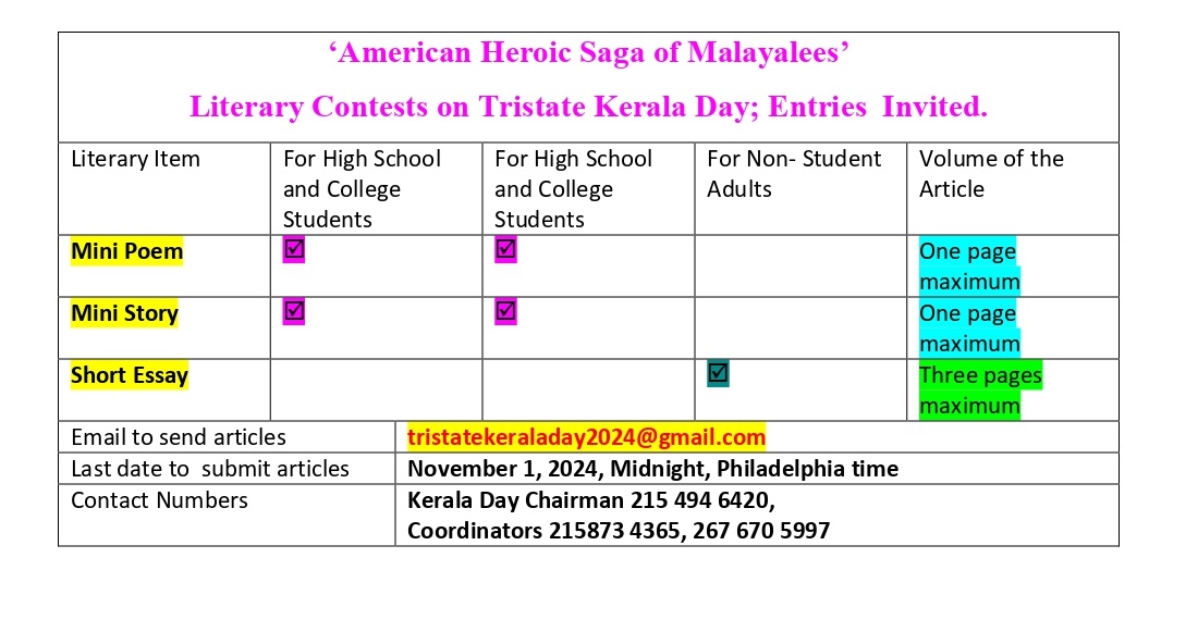 Tristate Kerala Forum conducts online English mini-story, and English mini-poem writing competitions for high school and college students, and Malayalam short essay writing competition for adults based on the concept of ‘American Heroic Saga of Malayalees’. Mini-story, and mini-poetry should not exceed one page each, and short essay should not exceed three pages. The concept of ‘American Heroic Saga of Malayalees’ signifies American life of the Malayalees, pertaining either of their career, family, social activities, politics, business, education, health service, spiritual scenarios, charity scenes, sports, journalism, scientific discovery, artistic activity, fashion , love affair, politics, illness, accident, or separation; expressing the conflicts of success and failure in a feeling way. There is no restriction for a student to participate both in mini-story, mini-poetry writing simultaneously. The articles with caption should be sent in PDF format. Author's name, email address, contact number preferably of parent of the student, and statement indicating ‘Student’ or ‘Non Student Adult’ should be attached with the literary work. E-mail to send the works: tristatekeraladay2024@gmail.com. Last date for receipt of works: Friday, November 1, 2024, up to 12 midnight. Winners will be felicitated and awarded on Saturday, November 9, 2024, at the Kerala Day Celebration hosted by the Tristate Kerala Forum, in the main congratulatory cultural program at Mayura Hall, Krewstown, Northeast Philadelphia. Prizes will be awarded during 4 pm through 6:30 pm. Entry is free for winners.
