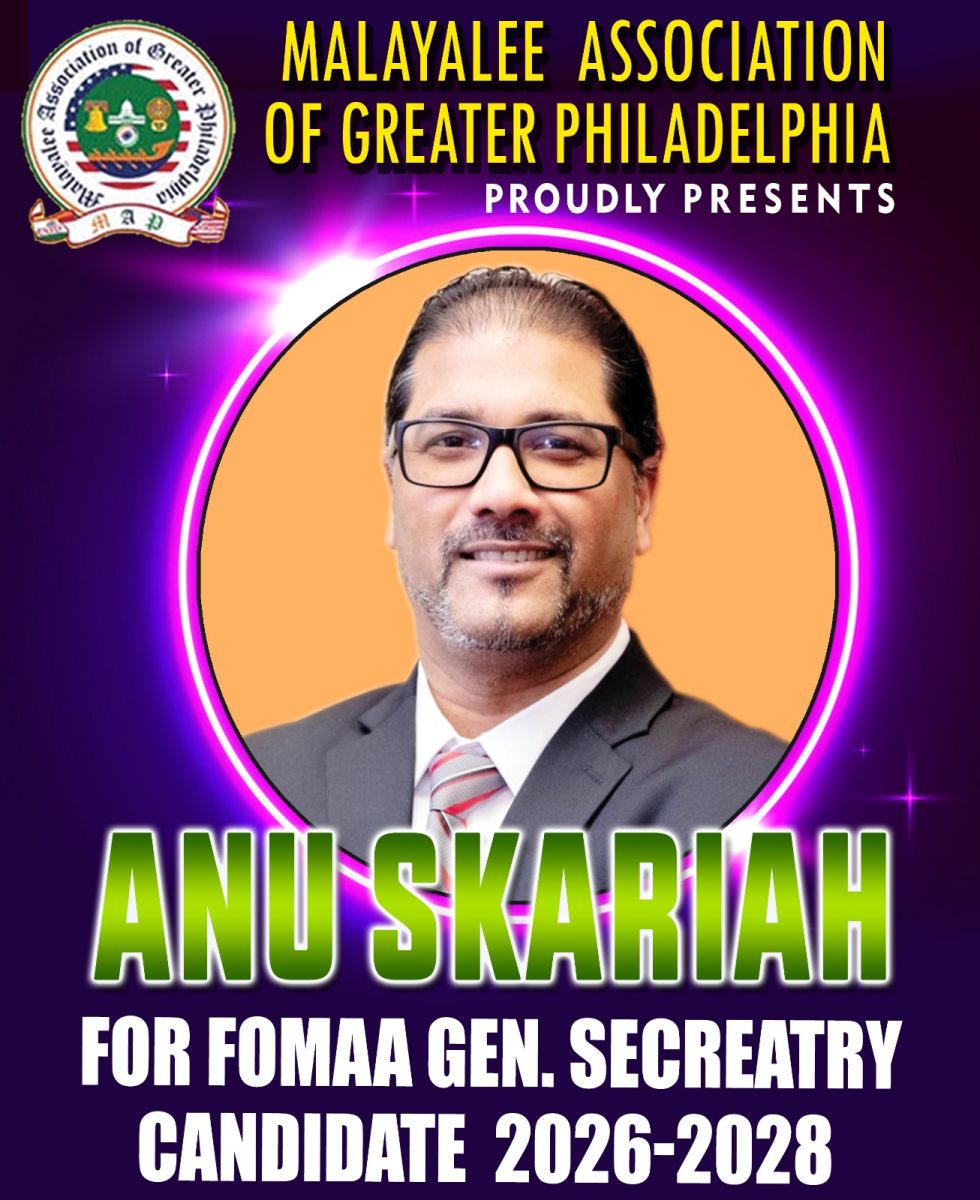 ഫിലഡൽഫിയയിലെ മലയാളി സമൂഹത്തിന്റെ ശക്തമായ ഐക്യം വളർത്താനുള്ള ഈ യാത്രയിൽ, അനു സ്കറിയയ്ക്ക് ഞങ്ങളുടെ പൂർണ്ണ പിന്തുണയും മികച്ച ആശംസകളും നേരുന്നു.