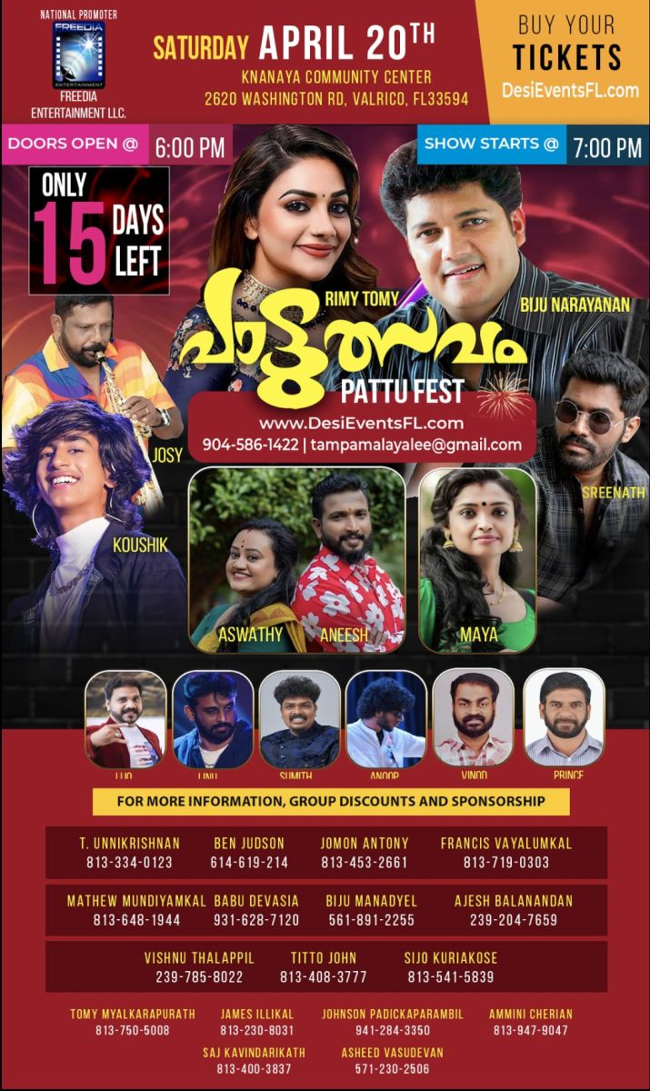 2024 ലെ മലയാളി മെഗാ ഷോ പാട്ടുത്സവം ഫ്രീഡിയ എന്റർടൈൻമെന്റ് റ്റാമ്പായിൽ ഏപ്രിൽ 20 ശനിയാഴ്ച്ച നടത്തുന്നു. ടിക്കറ്റുകൾ DesiEventsFL.com വെബ് സൈറ്റിൽ ലഭ്യമാണ്. ലിമിറ്റഡ് ടിക്കറ്റുകൾ മാത്രം ലഭ്യമായാൽ , എത്രയും വേഗം പരിപാടികളിൽ താല്പര്യമുള്ളവർ ടിക്കറ്റ് എടുക്കേണ്ടതാണ്. ഫ്ലോറിഡയിൽ ആകെയുള്ള ഒരേയൊരു ഷോ, റ്റാമ്പായിലാണ് നടക്കുന്നത്. വാൾറിക്കോയിലുള്ള ക്നാനായ കമ്മ്യൂണിറ്റി ഹാളിലാണ് (2620 Washington Rd , Valrico , FL 33594 ) പരിപാടി . വൈകുന്നേരം 6 മണിക്ക് അകത്തേക്ക് പ്രവേശിക്കാം, 7 മണിക്ക് പരിപാടികൾ ആരംഭിക്കും. മലയാളത്തിലെ ഏറ്റവും സ്റ്റേജ് പെർഫോമറായ റിമി ടോമിയുടെ പ്രകടനം സ്റ്റേജിൽ നേരിട്ടു കാണുവാനായി ഫ്ലോറിഡാ മലയാളികൾ ആവേശത്തോടെയാണ് കാത്തിരിക്കുന്നത്. 2024ലിൽ ഇതുവരെ കേരളത്തിൽ നിന്നും അമേരിക്കയിലെത്തിയ ഒരേയൊരു സ്റ്റാർ ഷോ കൂടിയാണിത് .