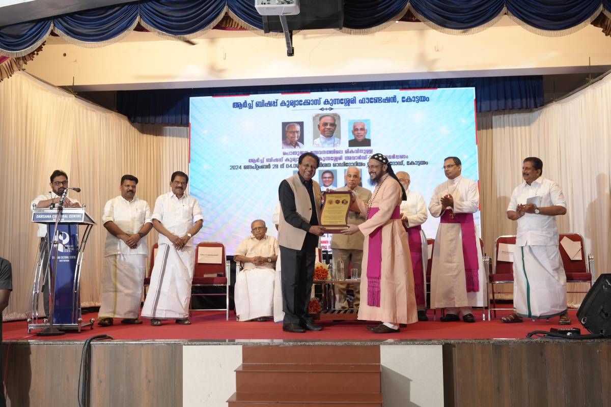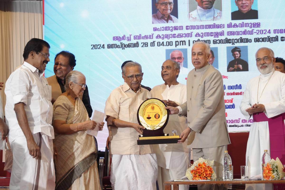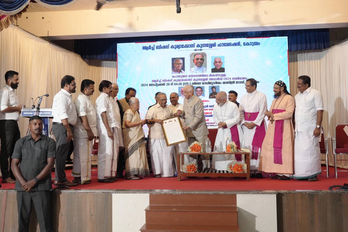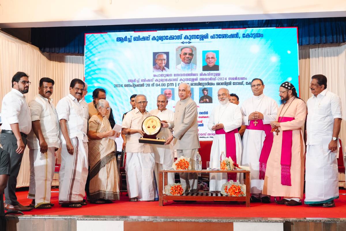 ആർച്ച് ബിഷപ്പ് കുര്യാക്കോസ് കുന്നശ്ശേരി ഫൗണ്ടേഷൻ മിച്ച പൊതുജന സേവകന് നൽകുന്ന 2024 ലെ അവാർഡ് ഡോ. മാത്യു പാറക്കലിന് ബഹു. ആന്ധ്രപ്രദേശ് ഗവർണർ ജസ്റ്റിസ് അബ്ദുൾ നാസർ നൽകുന്നു. ശ്രീമതി മറിയാമ്മ മാത്യു പാറക്കൽ, ഫൗണ്ടേഷൻ ചെയർമാൻ ജസ്റ്റിസ് സിറിയക്ക് ജോസഫ്, മാനേജിംഗ് ട്രസ്റ്റി തോമസ് ചാഴികാടൻ ExMP, ആർച്ച് ബിഷപ്പ് മാർ മാത്യു മൂലക്കാട്ട്, നിയുക്ത ആർച്ച് ബിഷപ്പ് മാർ തോമസ് തറയിൽ, ബിഷപ്പ് ഗീവർഗ്ഗീസ് മാർ അപ്രേം, മോൻസ് ജോസഫ് MLA, ടി.പി ശ്രീനിവാസൻ, സിറിയക്ക് ചാഴികാടൻ, ജോജോ ജോസഫ് സണ്ണി കുന്നശ്ശേരി എന്നിവർ സമീപം.