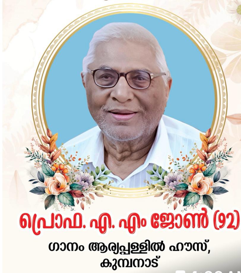 കുമ്പനാട് : ആര്യപ്പള്ളിൽ പരേതനായ ഏ .വി . മത്തായിയുടെ (ഉണ്ണിസാർ ) മകൻ പ്രൊഫ. എ. എം . ജോൺ (92) ആഗസ്റ്റ് 13 ബുധനാഴ്ച്ച വൈകിട്ട് നിത്യതയിൽ പ്രവേശിച്ചു. ഭാര്യ :. എലിസബത്ത് ജോൺ ആനപ്പറമ്പാൽ, ചിറ്റേഴത്ത് കുടുംബാഗമാണ് . മക്കൾ : ബിന്തു ഫിലിപ്പ് , സിന്ദു ജോൺസൺ , സന്തോഷ് ജോൺ .