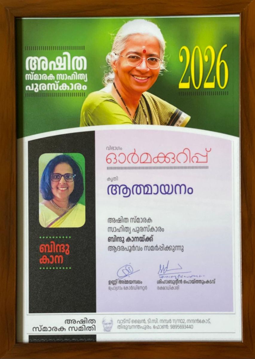 മലയാള സാഹിത്യത്തിലെ ഏകാന്തവും എന്നാൽ കരുത്തുറ്റതുമായ സ്വരമായിരുന്നു അഷിത. അഷിതയുടെ പേരിൽ നൽകപ്പെടുന്ന പുരസ്കാരം ബിന്ദു കാനയുടെ 'ആത്മായനം' എന്ന കൃതിക്ക് ലഭിക്കുമ്പോൾ അത് ചരിത്രപരമായ ഒരു കാവ്യനീതിയായി മാറുകയാണ്.