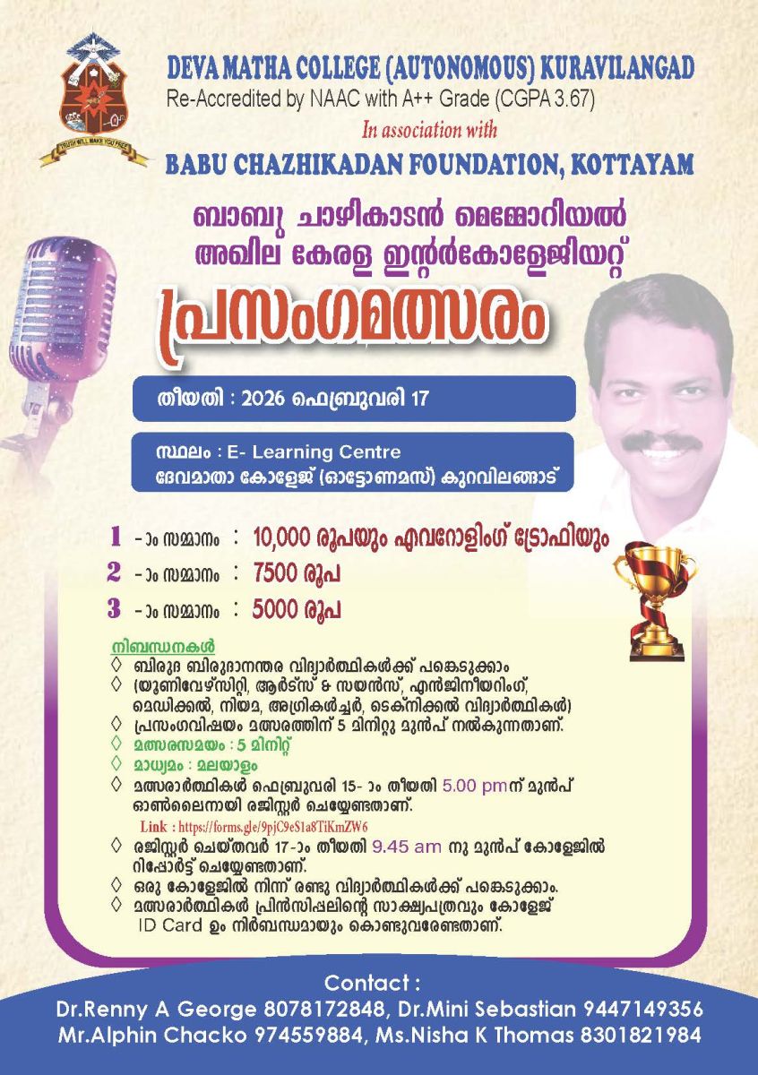 കുറവിലങ്ങാട്: ദേവമാതാ കോളേജ് (ഓട്ടോണമസ് ) ൻ്റെയും ബാബു ചാഴികാടൻ ഫൗണ്ടേഷൻ്റെയും സംയുക്താഭിമുഖ്യത്തിൽ 2026 ഫെബ്രുവരി 17-ന് അഖിലകേരള ഇൻ്റർ കോളേജിയറ്റ് പ്രസംഗമത്സരം സംഘടിപ്പിക്കുന്നു.ദേവമാതാ കോളേജിലെ പൂർവ്വവിദ്യാർത്ഥിയും കേരളരാഷ്ട്രീയത്തിൽ ഉദിച്ചുയരവെ അകാലത്തിൽ പൊലിഞ്ഞ പ്രതിഭയുമായ ബാബു ചാഴികാടൻ്റെ സ്മരണാർത്ഥം സംഘടിപ്പിക്കുന്ന ഈ മത്സരത്തിൽ കേരളത്തിലെ യൂണിവേഴ്സിറ്റികളിലും ആർട്ട്സ് ആൻഡ് സയൻസ്,എഞ്ചിനീയറിംഗ് ,മെഡിക്കൽ,നിയമ,അഗ്രികൾച്ചർ , ടെക്നിക്കൽ കോളേജുകളിലും ബിരുദ,ബിരുദാനന്തരതലത്തിൽ പഠിക്കുന്ന വിദ്യാർത്ഥികൾക്ക് പങ്കെടുക്കാം.ഫെബ്രു.17- ന് രാവിലെ 10 മണിക്ക് ആരംഭിക്കുന്ന മത്സരത്തിലെ വിജയികൾക്ക് ഒന്നാംസമ്മാനമായി ബാബു ചാഴികാടൻ മെമ്മോറിയൽ എവർറോളിംഗ് ട്രോഫിയും 10000 രൂപയും രണ്ടും മൂന്നും സ്ഥാനത്തിനർഹരാകുന്നവർക്ക് 7500,5000 എന്നിങ്ങനെ സമ്മാനത്തുകയും നൽകുന്നതാണെന്ന് സംഘാടകസമിതി ചെയർമാൻ ശ്രീ.തോമസ് ചാഴികാടൻ Ex.MP അറിയിച്ചു.