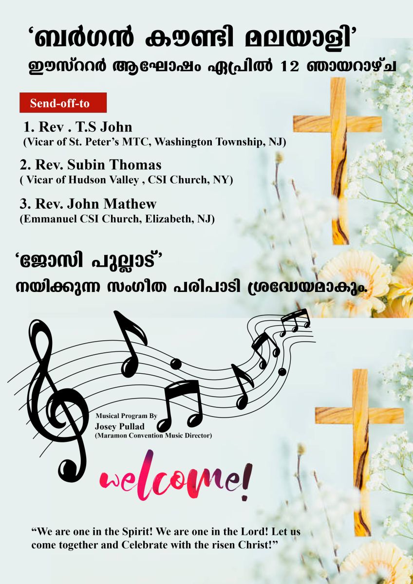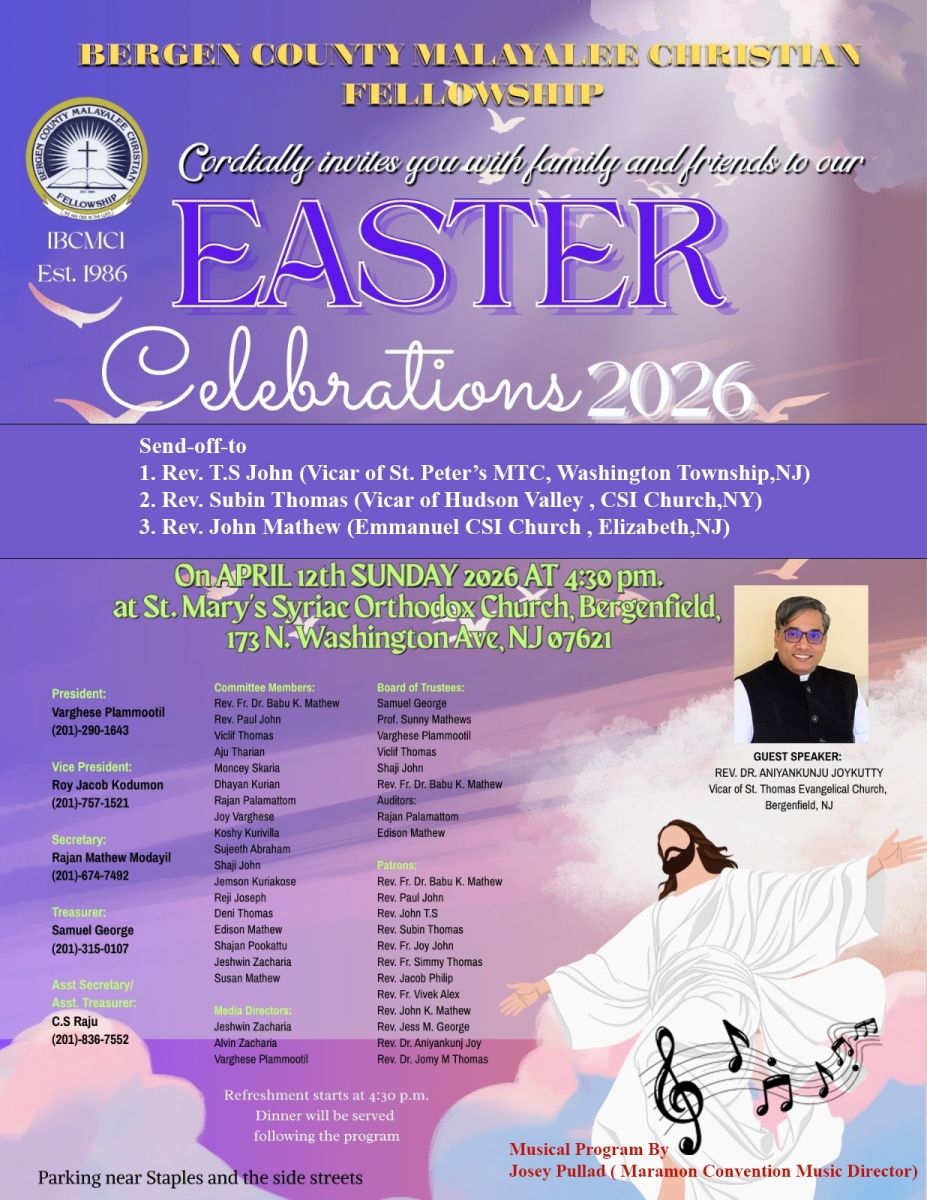 ബര്ഗന് കൗണ്ടി മലയാളി ക്രിസ്ത്യന് ഫെലോഷിപ്പിന്റെ ഈ വര്ഷത്തെ ഈസ്റ്റര് ആഘോഷം എപ്രില് 12 ഞായറാഴ്ച ബര്ഗന്ഫീല്ഡ് സെന്റ് മേരീസ് സിറിയക്ക് ഓര്ത്തഡോക്സ് ദേവാലയത്തില് വെച്ച് നടത്തപ്പെടും.