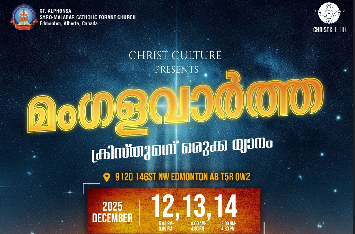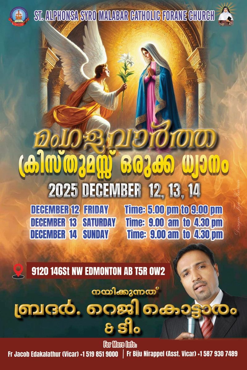 എഡ്മണ്ടൻ: അനുഗൃഹീത വചന പ്രഘോഷകനായ ബ്രദർ റെജി കൊട്ടാരത്തിന്റെ നേതൃത്വത്തില് ക്രൈസ്റ്റ് കള്ച്ചര് മിനിസ്ട്രി ടീം നയിക്കുന്ന 'മംഗളവാർത്ത' ധ്യാനം എഡ്മന്റൺ സെന്റ് അൽഫോൻസാ സീറോ മലബാർ കാത്തലിക് ഫൊറോനാ പള്ളിയിൽ.