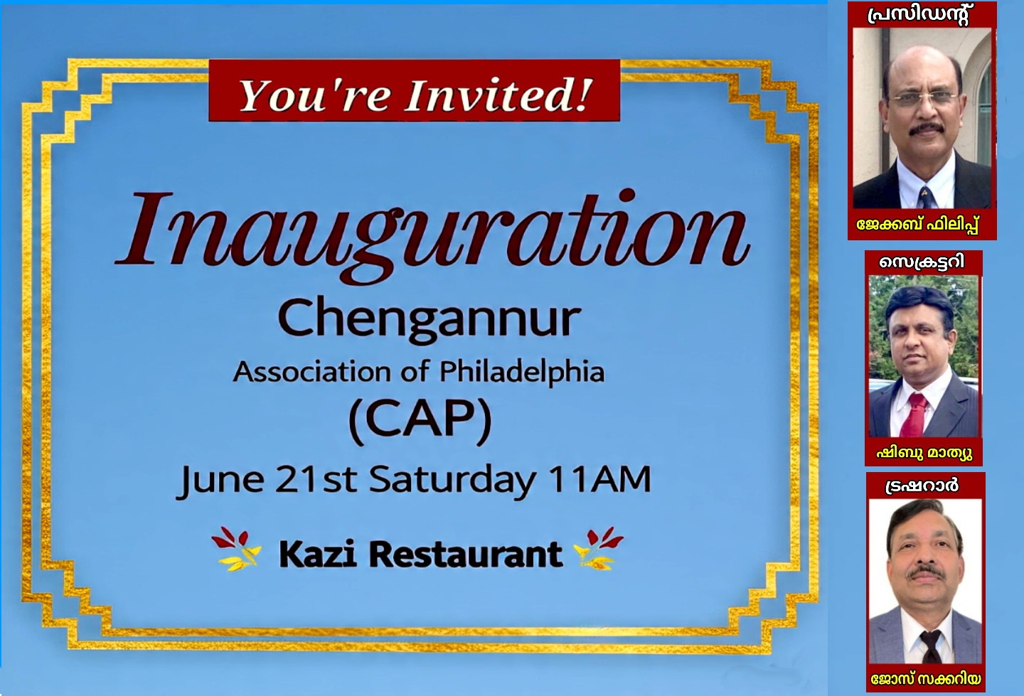 ഫിലഡൽഫിയ: ഫിലഡൽഫിയയുടെ വിവിധ ഭാഗങ്ങളിൽ അധിവസിക്കുന്ന ചെങ്ങന്നൂർ നിവാസികളുടെ ചിരകാല സ്വപ്നമായിരുന്ന ചെങ്ങന്നൂർ അസോസിയേഷന്റെ (CAP) പ്രവർത്തനോൽഘാടനം ജൂൺ 21-ാം തീയതി രാവിലെ 11 മണി മുതൽ കാസ്സി റെസ്റ്റോറന്റിൽവച്ച് നടത്തപ്പെടുന്നു. (Kazi's Tandoor & Grill, 10008 Verree Rd, Philadelphia, PA 19116)