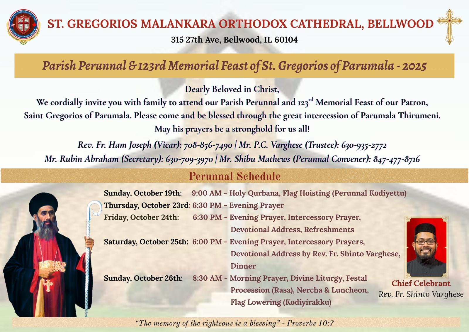 ചിക്കാഗോ: ബെല്വുഡ് സെന്റ് ഗ്രീഗോറിയോസ് ഓര്ത്തഡോക്സ് കത്തീഡ്രല് ഇടവക പെരുന്നാളും പരിശുദ്ധ പരുമല മാര് ഗ്രീഗോറിയോസ് തിരുമേനിയുടെ 123-ാണ്മത് ഓര്മ്മപ്പെരുന്നാളും ഒക്ടോബര് 24 മുതല് 26 വരെയായി കൊണ്ടാടുന്നു.