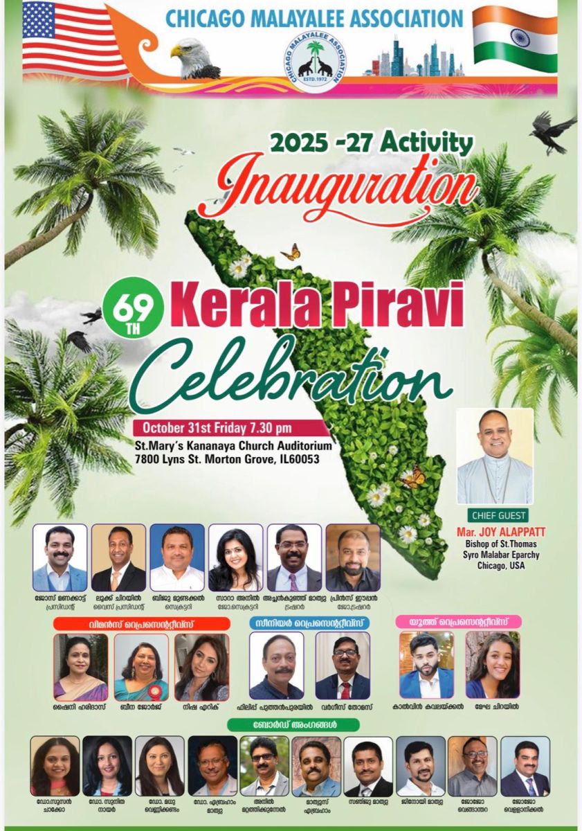 ചിക്കാഗോ മലയാളി അസോസിയേഷന്റെ 2025-27 വർഷത്തെ പ്രവർത്തന ഉദ്ഘാടനവും കേരളപ്പിറവി ആഘോഷവും ഒക്ടോബർ 31 വെള്ളിയാഴ്ച വൈകിട്ട് 7 മണിക്ക് മോർട്ടൻ ഗ്രോവ് സെന്റ് മേരീസ് ക്നാനായ ചർച്ച് ഓഡിറ്റോറിയത്തിൽ വെച്ച് നടക്കും. ഈ സംഘടനയുടെ അടുത്ത രണ്ടു വര്ഷത്തേക്കുള്ള പ്രവര്ത്തനങ്ങള് ഔപചാരികമായി തുടക്കം കുറിക്കുന്നത് സംഘടനയെ നാളിതുവരെ നയിച്ച മുന് പ്രസിഡന്റുമാരാണ്. അതോടൊപ്പം 69-ാമത് കേരളപ്പിറവിയുടെ ആഘോഷങ്ങള് ഷിക്കാഗോ സീറോ മലബാര് സഭാ പിതാവ് മാര് ജോയി ആലപ്പാട്ട് നിര്വഹിക്കും.