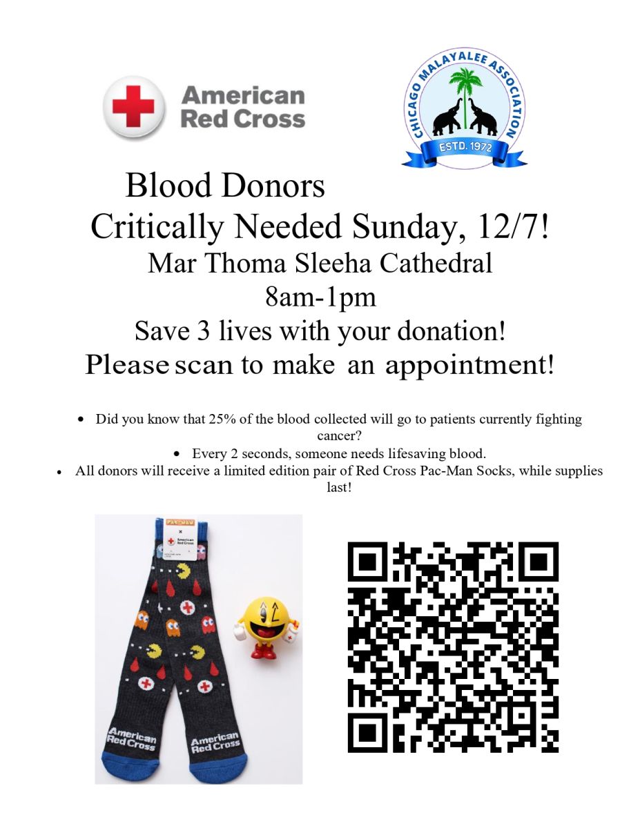ചിക്കാഗോ : ചിക്കാഗോ മലയാളി അസോസിയേഷന്റെ ആഭിമുഖ്യത്തിൽ ഒരു രക്തദാന ക്യാമ്പ് ഡിസംബർ 7 ഞായർ രാവിലെ 8 മണി മുതൽ ഉച്ചക്ക് 1 മണി വരെ ബെൽവുഡ് സിറോ മലബാർ കത്തീഡ്രൽ ഓഡിറ്റോറിയത്തിൽ വച്ച് നടത്തപ്പെടുന്നതാണ് .രക്തദാനം എന്നത് മറ്റുള്ളവരുടെ ജീവൻ രക്ഷിക്കാൻ ഉതകുന്ന ഏറ്റവും മികച്ച ഒരു മഹത്തായ പ്രവർത്തിയാണ് .സമൂഹത്തിൽ രക്തദാനത്തിന്റെ പ്രാധാന്യം ഉയർത്തിക്കാട്ടുന്നതിനായി ,ഇത്തരം ക്യാമ്പുകൾ തുടർന്നും സംഘടിപ്പിക്കുമെന്ന് ചിക്കാഗോ മലയാളി അസോസിയേഷൻ ഭാരവാഹികൾ അറിയിച്ചു .