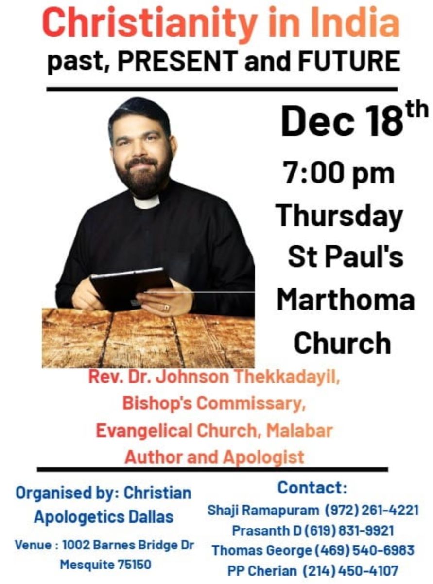 ഡാളസ് : ഇന്ത്യയിലെ ക്രൈസ്തവ സമൂഹത്തിൻ്റെ ഭൂതകാലം, വർത്തമാനകാലം, ഭാവി എന്നിവയെക്കുറിച്ച് ഒരു സെമിനാർ സംഘടിപ്പിക്കുന്നു.