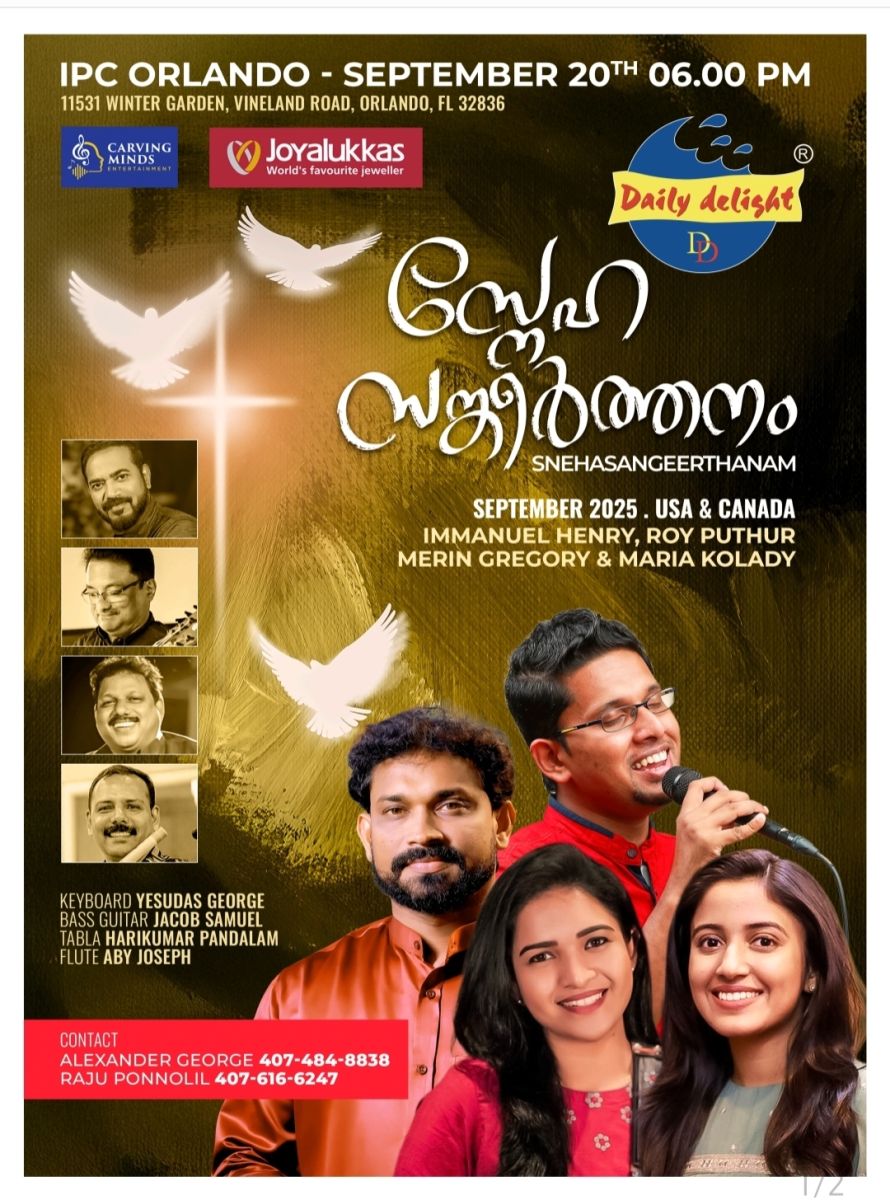 ജനലക്ഷങ്ങള്ക്ക് ആശ്വാസമായ സൂപ്പര് ഹിറ്റ് ഭക്തിഗാനങ്ങള് ലൈവ് ഓര്ക്കസ്ട്രയുടെ അകമ്പടിയോടെ നടത്തപ്പെടുന്ന പരിപാടിയില് പങ്കെടുക്കുവാന് കുറഞ്ഞ നിരക്കിലുള്ള ടിക്കറ്റുകള്ക്കായി ബദ്ധപ്പെടുക: www.ipcorlando.org/concert