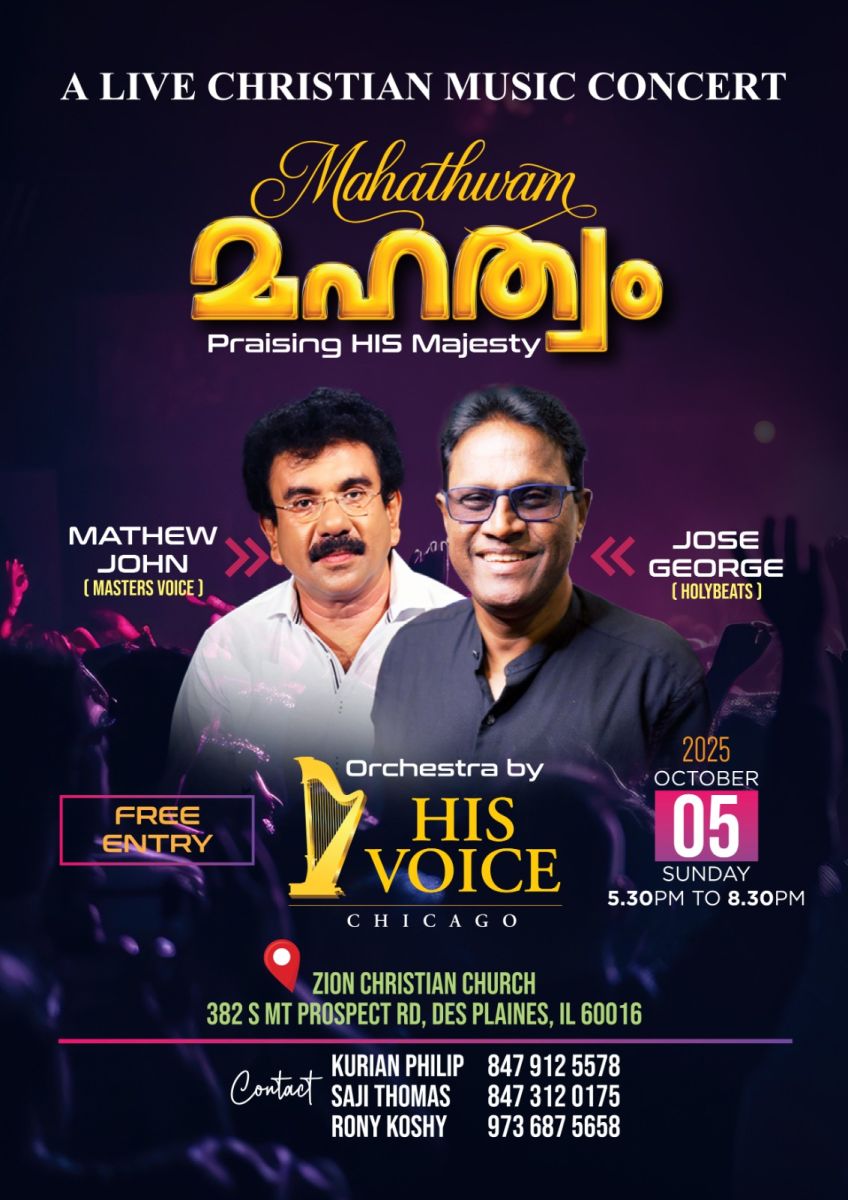 ചിക്കാഗോ: പ്രശസ്ത ക്രിസ്തീയ സംഗീത ഗായകരായ മാത്യു ജോൺ (മാസ്റ്റേഴ്സ് വോയിസ് കോട്ടയം), ജോസ് ജോർജ് (ഹോളി ബീറ്റസ് എറണാകുളം) എന്നിവർ നേതൃത്വം നൽകുന്ന ക്രിസ്തീയ സംഗീത പരിപാടി ഒക്ടോബർ 5 ഞായറാഴ്ച മൗണ്ട് പ്രൊസ്പെക്റ്റിൽ ഉള്ള സയോൺ ക്രിസ്ത്യൻ ചർച്ചിൽ നടക്കും. വൈകിട്ട് 5:30ക്ക് ആരംഭിക്കുന്ന സംഗീത പരിപാടി എട്ടരയ്ക്ക് സമാപിക്കും. ചിക്കാഗോയിലുള്ള ഹിസ് വോയിസ് ലൈവ് ഓർക്കസ്ട്ര ഒരുക്കും. പ്രവേശനം സൗജന്യമായിരിക്കും. പ്രമുഖ സാമൂഹിക പ്രവർത്തകനായ ജെയിബു കുളങ്ങരയാണ് ഗ്രാൻഡ് സ്പോൺസർ. ജെയിംസ് ജോസഫ്, ഗ്രേസ് പ്രിന്റിംഗ് എന്നവർ ഗോൾഡൻ സ്പോൺസർമാരും മാത്യൂസ് പിൽഗ്രിമേജ് ടൂർ, കൈരളി ഫുഡ്സ്, ലൂയി ചിക്കാഗോ എന്നിവർ സിൽവർ സ്പോൺസർമാരുമണ്.
