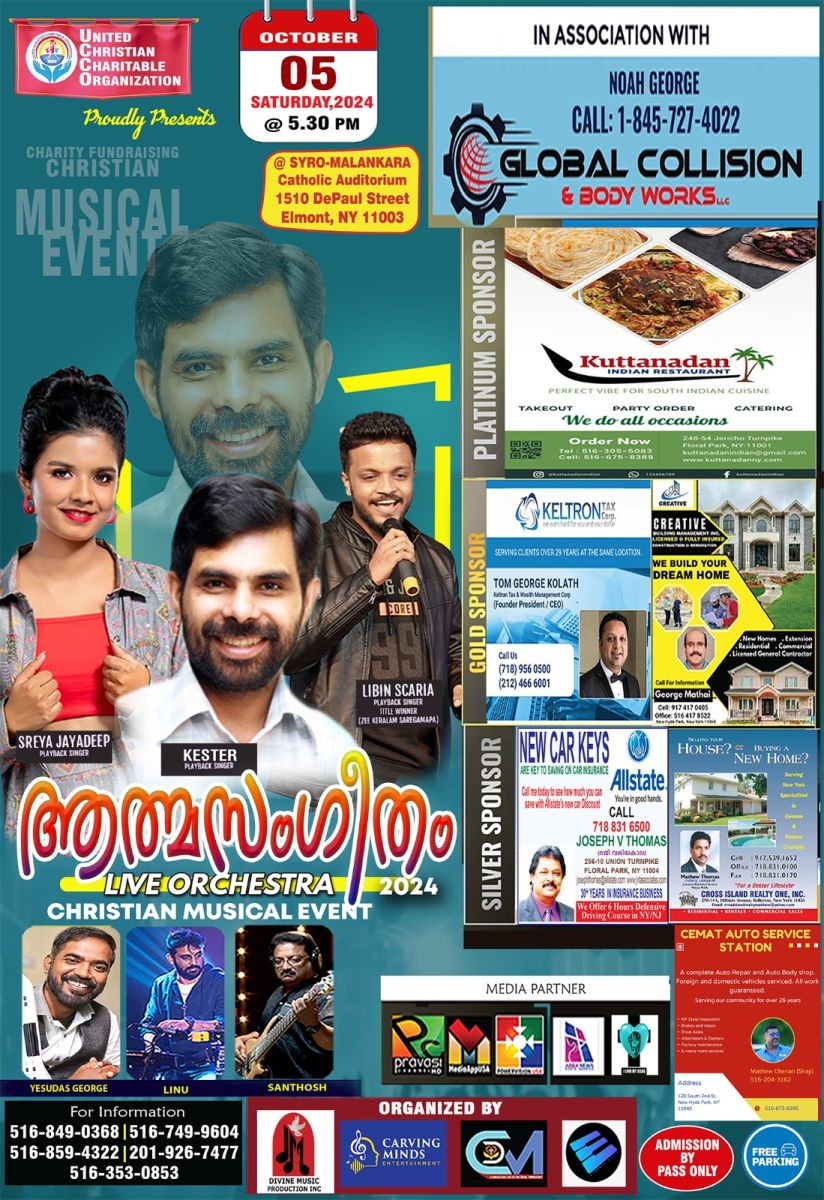 ന്യൂയോർക്ക്: ആത്മസംഗീതം ലൈവ് ഇൻ ക്രിസ്ത്യൻ മ്യൂസിക്കൽ നൈറ്റ് ഒക്ടോബർ 5ന് ശനിയാഴ്ച വൈകിട്ട് 5.30ന് സിറോ - മലങ്കര കാത്തോലിക് ഓഡിറ്റോറിയത്തിൽ വെച്ച് (1510 DePaul Street, Elmont, NY 11003 ) വച്ചു നടത്തുന്നു. ക്രിസ്തീയഗാന രംഗത്ത് അതുല്ല്യപ്രതിഭയും അനുഗ്രഹീതതുമായ ജനപ്രിയ ഗായകൻ കെസ്റ്ററും, പ്രശസ്ത ഗായകൻ ലിബിൻ സ്കറിയ, ഗായിക ശ്രേയ ജയദീപും ഈ ലൈവ് ഷോയിൽ പങ്കെടുക്കും. യുണൈറ്റഡ് ക്രിസ്ത്യൻ ചാരിറ്റബിൾ ഓർഗനൈസേഷൻ ഇൻ അസോസിയേഷൻ വിത്ത് ഗ്ലോബൽ കൊളിഷൻ കോഗ്ഗേർസ് (Global collision & body work, Congers (Noah George) എന്നിവരുടെ നേത്യത്വത്തിലാണ് ഈ സംഗീതവിരുന്ന് ഒരുക്കുന്നത്.
