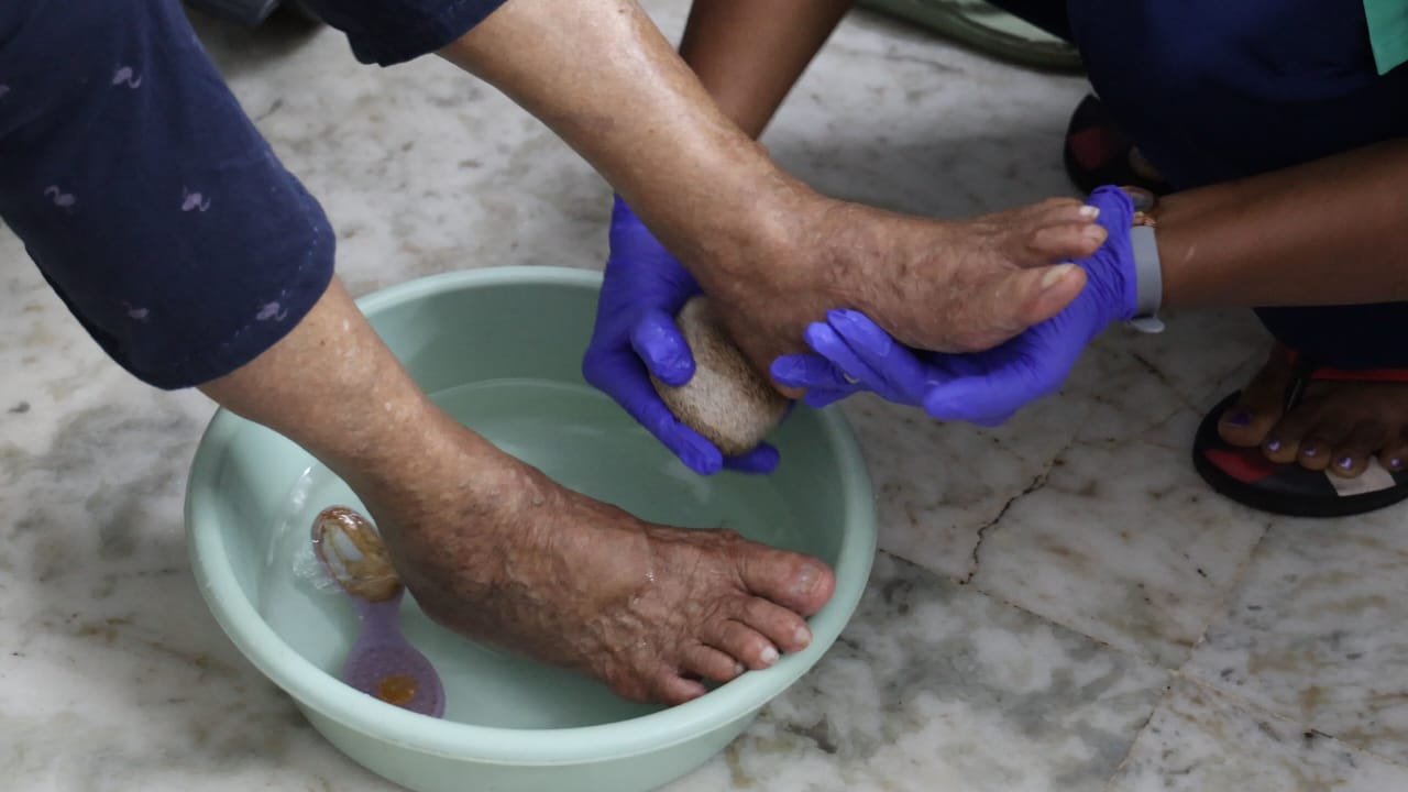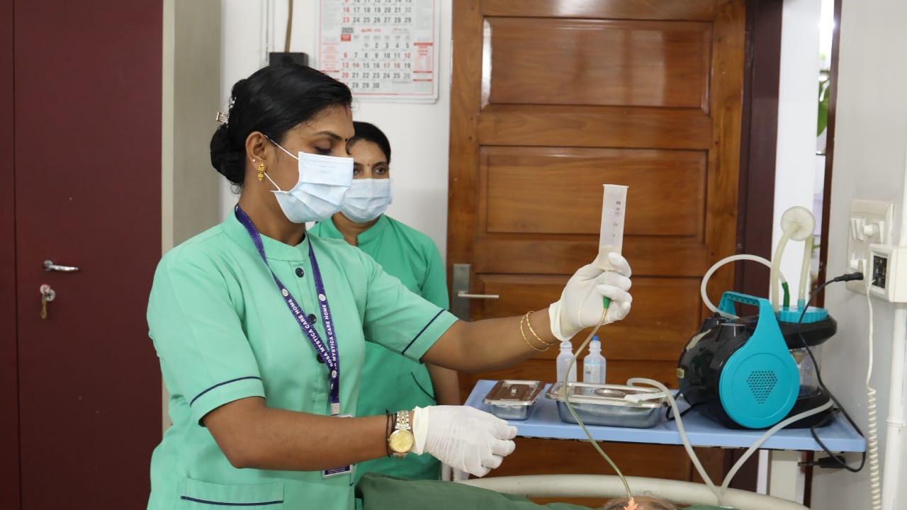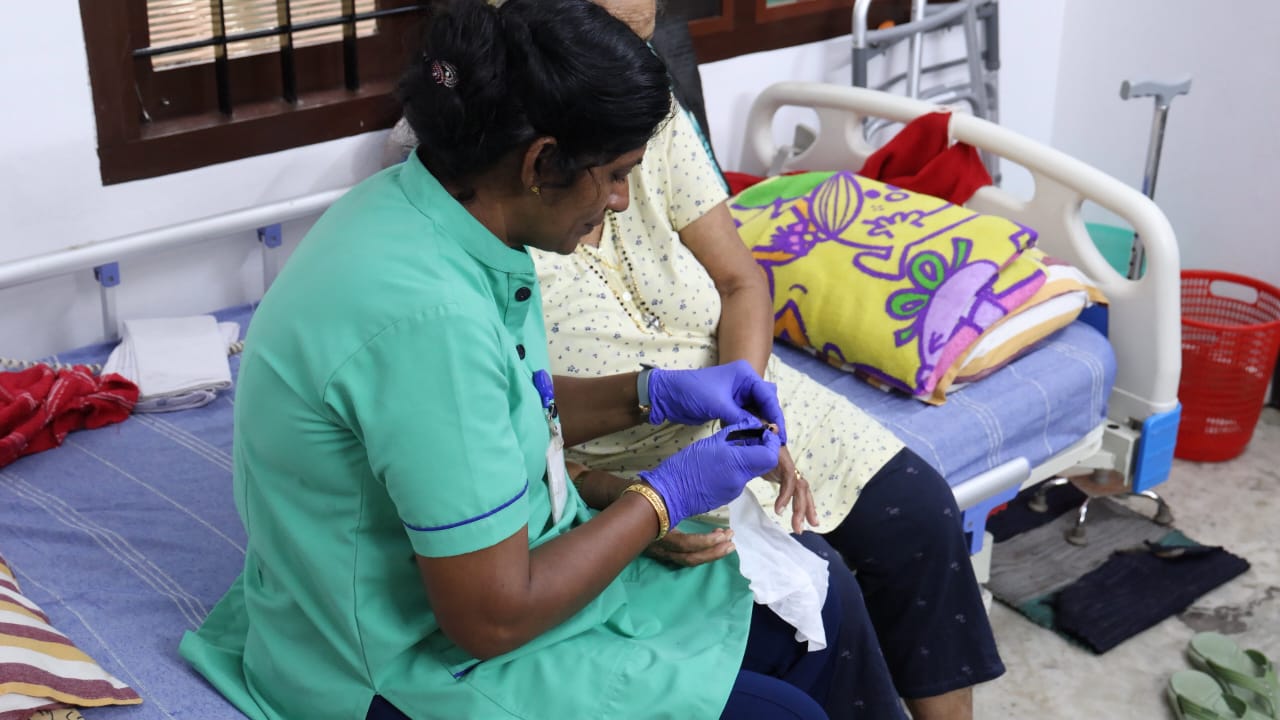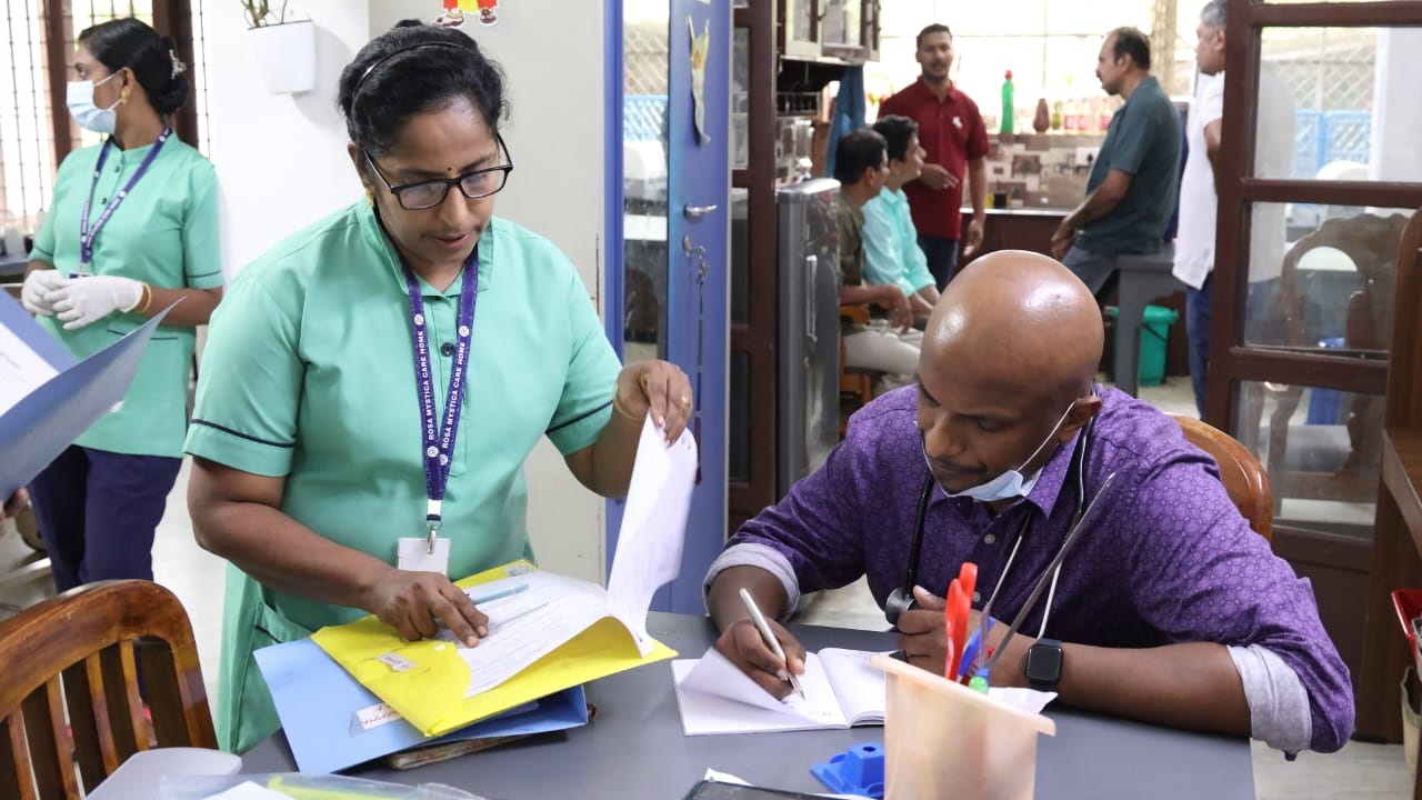 ഇവരുടെ മെഡിക്കല് കാര്യങ്ങള് കൈകാര്യം ചെയ്യുന്നത് എപ്പോഴും നഴ്സുമാര് ആണെന്നതും മറ്റൊരു ശ്രദ്ധിക്കപ്പെട്ട കാര്യമാണ്. 45 ഓളം ജീവനക്കാരില് 20 പേര് തന്നെ നഴ്സുമാരാണ്. ബാക്കിയുള്ളവര് ക്ലീനിങ്, കിച്ചന്, അഡ്മിനിസ്ട്രേറ്റീവ്, പിആര് ഓ, എം.എസ്.ഡബ്ലിയു കഴിഞ്ഞവര് അങ്ങനെയങ്ങനെ... മൂന്ന് ഷിഫ്റ്റ് ആയിട്ടാണ് ഇവരെ ഡ്യൂട്ടികള് ഏല്പ്പിച്ചിരിക്കുന്നത് - മോണിംഗ്, ഈവനിംഗ്, നൈറ്റ്. ജോലിഭാരം തോന്നാതിരിക്കാനും ജോലി ചെയ്യുന്നവര്ക്ക് മടുപ്പ് തോന്നാതിരിക്കാനുമാണ് ഇത്തരത്തില് ഷിഫ്റ്റ് ഏര്പ്പെടുത്തിയിട്ടുള്ളത്. നഴ്സിംഗ് കെയറില് ഉള്ളവര്ക്ക് പ്രധാനമായും അവരുടെ ബിപി, ഷുഗര്, സോഡിയം, പൊട്ടാസ്യം, എച്ച് ബി,ഇന്ഫെക്ഷന് എന്നിങ്ങനെ വേരിയേഷന് സംഭവിക്കാന് സാധ്യതയുള്ള രോഗാവസ്ഥകളെ മോണിറ്റര് ചെയ്യുക എന്ന വലിയ ദൗത്യമാണ് ചെയ്യേണ്ടതായിട്ടുള്ളത്. ഓരോരുത്തര്ക്കും രോഗങ്ങളും രോഗാവസ്ഥയും രേഖപ്പെടുത്തിയ ഫയലുകള് ഉണ്ട്. അതില് ഡോക്ടറുടെ നിര്ദ്ദേശപ്രകാരമാണ് എല്ലാം ചെക്ക് ചെയ്യുന്നത്. യൂറിനില് എന്തെങ്കിലും നിറവ്യത്യാസം ഉണ്ടെങ്കില് തന്നെ നേഴ്സുമാര്ക്ക് അവരുടെ രോഗാവസ്ഥയെ അറിയാനും പെട്ടെന്ന് തന്നെ ആന്റിബയോട്ടിക്കുകള് ഡോക്ടറുടെ ചികിത്സയിലൂടെ നല്കാനും സാധിക്കും. രാത്രിയില് ശരിയായി ഉറങ്ങുന്നുണ്ടോ എന്നുവരെ ശ്രദ്ധയോടെ നിരീക്ഷിക്കാറുണ്ട് ഇവിടെയുള്ളവര്. ഉറക്കമില്ലാത്തവരുടെ സ്ഥിതിയെപ്പറ്റി കുടുംബാംഗങ്ങളെ അറിയിച്ച്, ഉറങ്ങാനുള്ള മെഡിസിന്, അത് ന്യൂറോ ആയാലും സൈക്യാട്രിക് ആയാലും കുടുംബാംഗങ്ങളുടെ അറിവോടും സമ്മതത്തോടും മാത്രമാണ് നല്കുന്നത്. എന്തിനും ഒരു സുതാര്യതയുണ്ട്. പരിചരണത്തിലും ഹോസ്പിറ്റലില് കൊണ്ടുപോകുമ്പോഴും സ്വന്തം അച്ഛനമ്മമാരെന്ന വികാരത്തോട് കൂടിയാണ് എല്ലാവരും പെരുമാറുന്നത്.