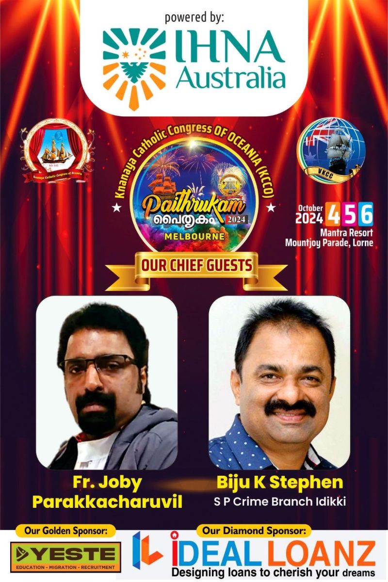 ഒക്ടോബർ 2-ാം തീയതി ബുധനാഴ്ച വൈകിട്ട് മെൽബൺ എയർപ്പോർട്ടിൽ എത്തിചേരുന്ന പൈതൃകം 2024 -ലെ വിശിഷ്ഠാ അതിഥികൾ ആയ ഫാദർ ജോബി പാറയ്ക്കചെരുവിൽ, (യു.എസ്.എ.) ബിജു കെ.സ്റ്റീഫൻ സൂപ്രണ്ടന്റ് ഓഫ് പോലീസ് (ക്രൈം ബ്രാഞ്ച്