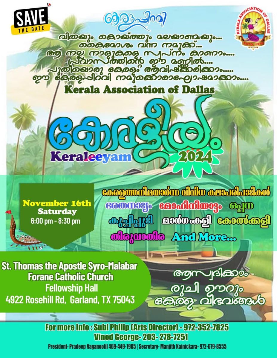 ശനിയാഴ്ച വൈകീട്ട് 6 മുതൽ 8:30 വരെ ഗാർലൻഡിലെ സെൻ്റ് തോമസ് സീറോ മലബാർ ചർച്ച് ജൂബിലി ഹാളിലാണ് പരിപാടികൾക്ക് തിരശീല ഉയരുന്നത്