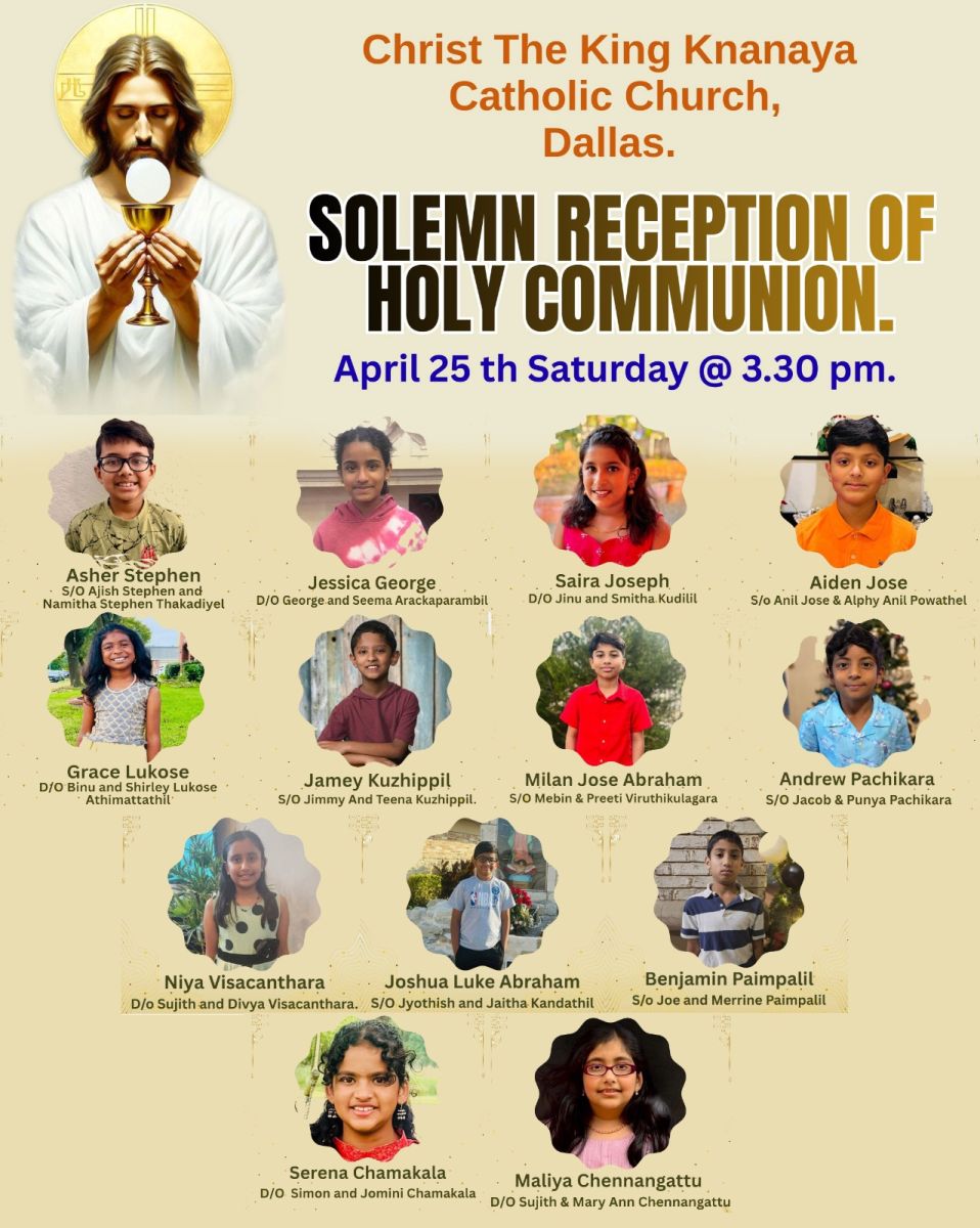 : ഡാളസ്സ്: ഡാളസ്സ് ക്രിസ്തുരാജ ക്നാനായ കത്തോലിക്ക പള്ളി ഇടവക ആഘോഷമായ ദിവ്യകാരുണ്യ സ്വീകരണം ഏപ്രിൽ 25 ശനിയാഴ്ച ഉച്ചകഴിഞ്ഞ് 3.30 ന് നടത്തപ്പെടും. ഈ വർഷം 29 കുട്ടികൾ ദീവ്യകാരുണ്യ നാഥനെ ആഘോഷമായി സ്വീകരിക്കാൻ പ്രാർത്ഥനാപൂർവ്വം ഒരുങ്ങീരിക്കുന്നത്. ലിയാ മാടപറമ്പത്ത്, നേത്തൻ മാടപറമ്പത്ത്, നീയ തടത്തിൽ, മിലാഹ് എട്ടുപറയിൽ,അലക്സീസ് ചെമ്മാച്ചേൽ , നീവാഹ് വിരുത്തിക്കുളങ്ങര, ക്ളെയർ അരിച്ചിറ,നീയൽ ചെമ്മാച്ചേൽ, കാതറിൻ സ്രാമ്പിച്ചിറ, എലിയറ്റ് മുടിക്കുന്നേൽ, സഞ്ചന കാവിൽ, ജോഷ്വാ പുത്തൻപറവിൽ, ജോഷ്വാ ഏലൂർ, ജോർജ് കാരത്തുരുത്തേൽ, ജറമിയ ഓളിയിൽ, ഫെലിക്സ് കോയിത്തറ, അഷേർ തകടിയേൽ, ജെസിക്ക അറയ്ക്കപറമ്പിൽ, സെയിറ കുടിലിൽ, എയ്ഡൻ പൗവ്വത്തേൽ, ആഡ്രൂ പച്ചിക്കര, മിലൻ വിരുത്തിക്കുളങ്ങര, ജെമി കുഴിപ്പിൽ, ഗ്രയിസ് അത്തിമറ്റത്തിൽ , നിയ വിശാഖന്തറ, ജോഷ്യാ കണ്ടത്തിൽ, ബെഞ്ചമിൻ പയ്യമ്പള്ളിൽ, മലിയ ചേന്നക്കാട്ട്, സെറീന ചാമക്കാല തുടങ്ങിയ കുട്ടികൾ ദീവ്യകാരുണ്യ സ്വീകരണത്തിനായി ഒരുങ്ങുന്നത്. ഇവരുടെ മാതാപിതാക്കളുടെ വിവിധ കമ്മിറ്റി അംഗങ്ങളുടെ നേതൃത്വത്തിൽ ഒരുക്കങ്ങൾ പുരോഗമിക്കുന്നു. ഇടവകയുടെ ഏറെ അനുഗ്രഹീതമായ ഈ ദിവസത്തിന്റെ പുണ്യം കുഞ്ഞുങ്ങളിൽ നിറയാൻ ഏവരും പ്രാർത്ഥിക്കണം എന്ന് വികാരി ഫാ. ബിൻസ് ചേത്തലിൽ ഏവരോടും ആവിശ്യപ്പെട്ടു.