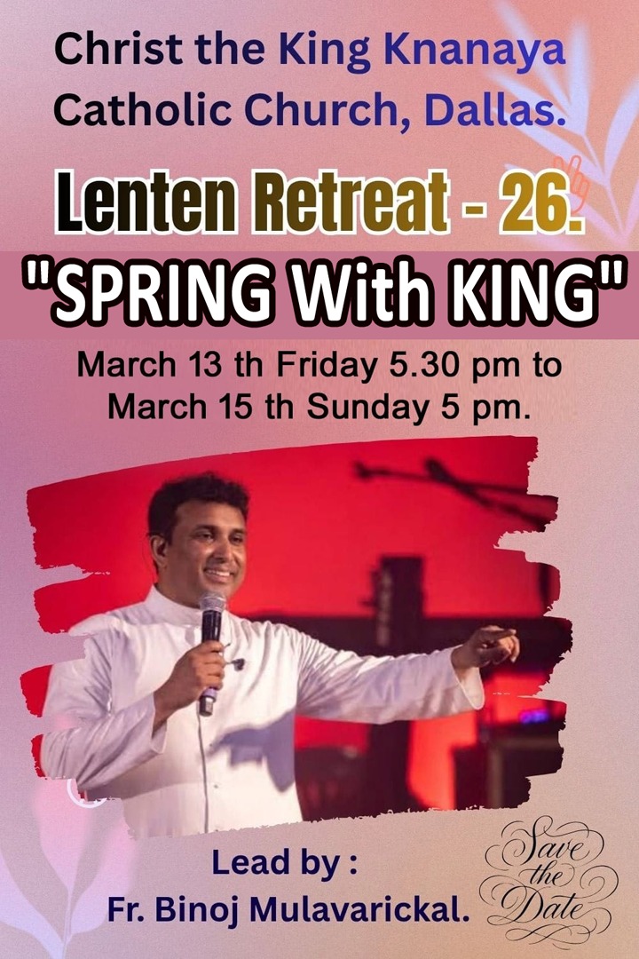 ഡാളസ് ക്രിസ്തുരാജ ക്നാനായ കത്തോലിക്ക ഇടവകിൽ നോമ്പ്കാല വാർഷികധ്യാനം മാർച്ച് 13 വെള്ളിയാഴ്ച വൈകിട്ട് 5 മുതൽ 15 ഞായർ വൈകിട്ട് 5 വരെ നടത്തപ്പെട്ടും. മാർച്ച് 14, 15 ദിവസങ്ങളിൽ കുട്ടികൾക്കായ് പ്രത്യേകം ടീം അംഗങ്ങൾ ധ്യാനം നയിക്കും, മുതിർന്നവർക്കായ് ഫാ. ബിനോജ് മുളവൊരിക്കൽ ധ്യാന ശുശ്രൂഷയ്ക്ക് നേതൃത്വം വഹിക്കുന്നത് . മാർച്ച് 14 ശനിയാഴ്ച എല്ലാവർക്കും അനുതാപ ശുശ്രൂഷയ്ക്ക് ഉള്ള അവസരം ഉണ്ടായിരിക്കും.പ്രയർ ഗ്രൂപ്പ് അംഗങ്ങളുടെ നേതൃത്വത്തിൽ ഒരുക്കങ്ങൾ നടത്തപ്പെടുന്നു.