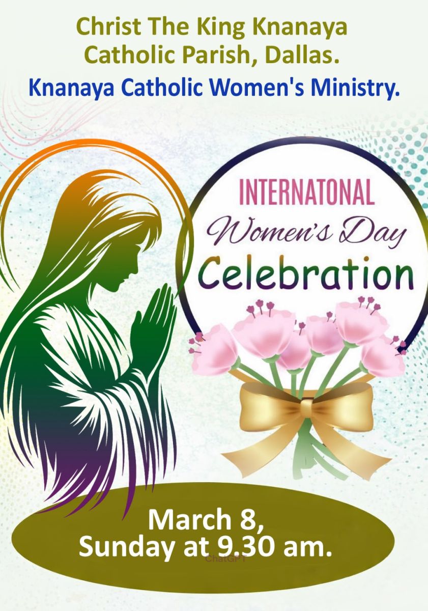ഡാളസ്: ഡാളസ് ക്രിസ്തുരാജ ക്നാനായ കത്തോലിക്ക ഇടവക ദൈവാലയത്തിൽ വീമൺസ് മിനിസ്ട്രി യുടെ നേതൃത്വത്തിൽ ഇന്റർനാഷ്ണൽ വനിതാ ദിനാഘോഷം വിപുലമായ പരുപാടികളോടെ മാർച്ച് 8 ഞായറാഴ്ച നടത്തപ്പെടും. അന്നേ ദിവസം വനിതകൾ കൃതജ്ഞതാ ബലിക്ക് ശേഷം സ്ത്രീകളിൽ അനുഗ്രഹീതയായ പരി. അമ്മയ്ക്ക് കാഴ്ച സമർപണം നടത്തപ്പെടും തുടർന്ന് ഉടവകയിലെ ഏറ്റവും മുതിർന്ന വനിതയെ പ്രത്യേകം ആദരിക്കും. അന്നേ ദീവസം വനിതകൾക് മെന്റൽ ഹെൽത്ത് എന്ന വിഷയത്തെ ആസ്പദമാക്കി ഡോ.ഷൈനി അബ്രാഹം നിരപ്പേൽ സെമിനാർ നയിക്കും. വനിതാദിനത്തോട് അനുബന്ധിച്ച് വനിതകൾക്കായി വിവിധ മത്സരങ്ങളും നടതപ്പെടും. നോമ്പുകാല ചൈതന്യത്തിൽ മീഷണറീസ് ഓഫ് ചാരിറ്റി സിസ്റ്റേഴ്സുമായി സഹകരിച്ച് പാവപെട്ടവർക്ക് വേണ്ട അവിശ്യ സാധനങ്ങൾ ശേഖരിച്ച് അവർക്കായി വനിതാദിനത്തിൽ നൽകുന്നു.വിമൺസ് മിനിസട്രി പ്രസിഡന്റ് സിൽവി നടക്കുഴയ്ക്കൽ, എക്സിക്യൂട്ടിവ് അംഗങ്ങൾ ആൽഫി പവ്വത്തേൽ, ജോസി ക്ളാക്കിൽ, റാണി ചോരത്ത്, അനില പാലുത്തറ, ജോമിനി ചാമക്കാല, ജെസിൽ മാങ്ങാച്ചാലിൽ, ജോതിസ് കരിങ്ങനാത്ത്, മാത്യു പ്ളാക്കാട്ടിൽ, റ്റീന കുഴിപ്പിൽ, സിസ്റ്റർ അഡ്വൈസർ സി. സബിത എന്നിവരുടെ നേതൃത്വത്തിൽ ഒരുക്കങ്ങൾ നടത്തപ്പെടുന്നു..