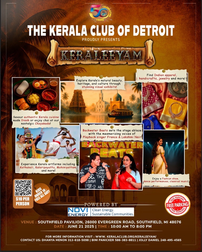 മിഷിഗൺ: 1975-ൽ സ്ഥാപിതമായ മിഷിഗണിലെ ആദ്യ ഇന്ത്യൻ കലാ സാംസ്കാരിക സംഘടനയായ ഡിട്രോയിറ്റ് കേരള ക്ലബ്ബിന്റെ സുവർണ്ണ ജൂബിലി ആഘോഷം "കേരളീയം" ജൂൺ 21-ന് സൗത്ഫീൽഡ് പവലിയനിൽ വെച്ച് രാവിലെ 10 മണി മുതൽ വൈകിട്ട് 8 വരെ നടത്തപ്പെടും. അഞ്ച് പതിറ്റാണ്ട് പിന്നിട്ട ഈ പ്രസ്ഥാനം കേരളീയം എന്ന മെഗാ ഷോയിലൂടെ കേരളത്തിന്റെ കലാ സാംസ്കാരിക പാരമ്പര്യവും വിശ്വാസാചാര മൂല്യങ്ങളും വിളിച്ചോതുന്ന വർണ്ണാഭമായ പരിപാടികളാണ് അവതരിപ്പിക്കുന്നത്.