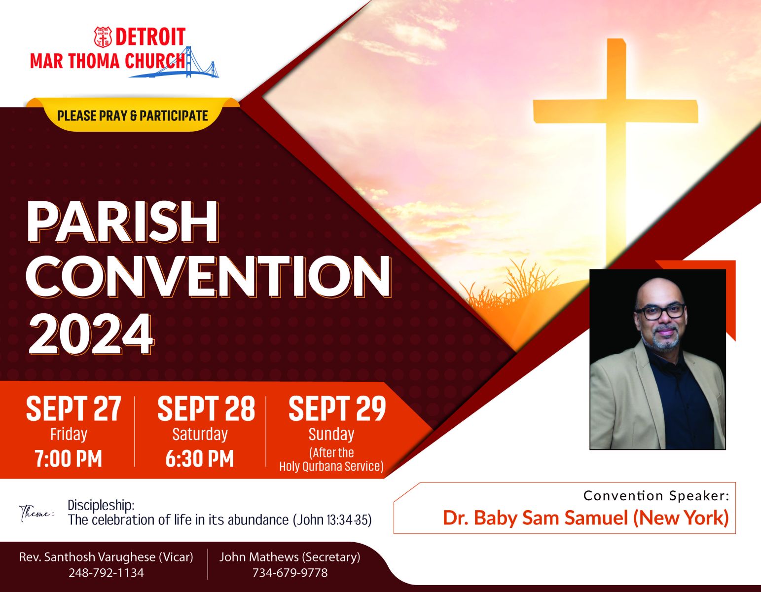 മിഷിഗൺ: ഡിട്രോയിറ്റ് മാർത്തോമ്മാ പാരിഷ് കൺവൻഷൻ സെപ്റ്റംബർ 27 മുതൽ 29 വരെ ഡിട്രോയിറ്റ് മാർത്തോമ്മാ പള്ളിയിൽ വെച്ച് നടത്തപ്പെടും. ഈ വർഷത്തെ പാരിഷ് കൺവൻഷനിൽ പ്രശസ്ത കൺവൻഷൻ പ്രാസംഗികൻ ഡോ. ബേബി സാം ശാമുവേൽ (ന്യൂയോർക്ക്) പ്രസംഗിക്കും. സെപ്റ്റംബർ 27 വെള്ളിയാഴ്ച്ച വൈകിട്ട് 7-നും സെപ്റ്റംബർ 28 ശനിയാഴ്ച്ച വൈകിട്ട് 6:30-നും കൺവൻഷൻ യോഗങ്ങൾ ആരംഭിക്കും. സെപ്റ്റംബർ 29 ഞായറാഴ്ച്ച ആരാധനയോടു ചേർന്ന് കൺവൻഷന്റെ സമാപന സമ്മേളനം നടക്കും. ഡിട്രോയിറ്റ് മാർത്തോമ്മാ ക്വയർ ഗാനശുശ്രൂഷക്ക് നേതൃത്വം നൽകും. ഈ കൺവൻഷനിലേക്ക് ഏവരേയും സ്വാഗതം ചെയ്യുന്നതായി വികാരി റവ. സന്തോഷ് വർഗീസ്, സെക്രട്ടറി ജോൺ മാത്യൂസ് എന്നിവർ അറിയിച്ചു.