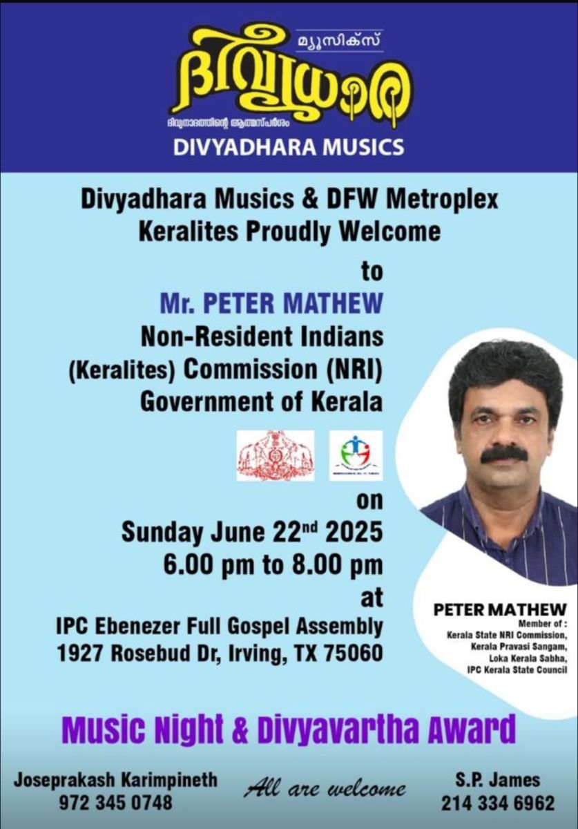 ഇർവിങ് (ഡാളസ്):ഡിഎഫ്ഡബ്ല്യു മെട്രോപ്ലക്സ് ദിവ്യാധാര മ്യൂസിക്സ് മ്യൂസിക്സ് നൈറ്റും അവാർഡ് ദാനവും സംഘടിപ്പിക്കുന്നു. 2025 ജൂൺ 22 ഞായറാഴ്ച വൈകുന്നേരം 6.00 മുതൽ രാത്രി 8.00 വരെ ഐപിസി എബനേസർ ഫുൾ ഗോസ്പൽ അസംബ്ലിയിലാണ്(1927 റോസ്ബഡ് ഡോ, ഇർവിംഗ്, ടെക്സാസ് 75060).വേദി ഒരുക്കിയിരിക്കുന്നത്