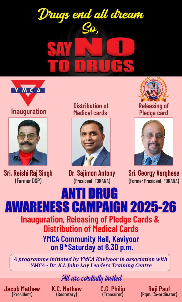 "Say no to drugs" എന്ന കാമ്പയിൻ വൈ എം സി എ ഫലപ്രദമായി നടത്തിക്കൊണ്ടിരിക്കുന്നു.