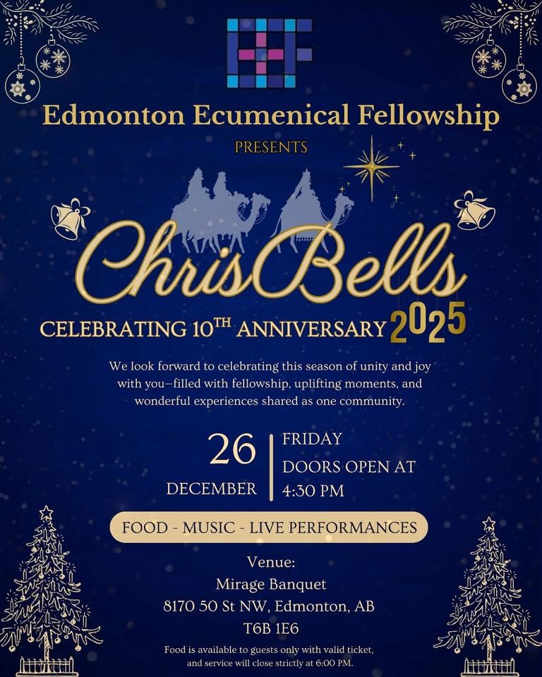 പത്താം വാർഷികാഘോഷങ്ങളുടെ ഭാഗമായി സംഘടിപ്പിക്കുന്ന വാർഷിക ക്രിസ്മസ് സംഗമം 'ക്രിസ്ബെൽസ് 2025 ' ഡിസംബർ 26-ന് 50-ാം സ്ട്രീറ്റിലെ മിറേജ് ബാങ്ക്വറ്റ് ഹാളിൽ നടക്കും. ഫോർട്ട് സസ്കാച്വൻ എം.പി ഗാർനെറ്റ് ജീനിയസ് ആഘോഷങ്ങൾ ഉദ്ഘാടനം ചെയ്യും, അതോടൊപ്പം ഫെലോഷിപ്പിന്റെ പുതിയ വെബ്സൈറ്റിന്റെ പ്രകാശനവും അദ്ദേഹം നിർവ്വഹിക്കും. എഡ്മന്റൺ എക്യുമെനിക്കൽ ഫെലോഷിപ്പ് പ്രസിഡന്റ് റവ. തോമസ് പൂതിയോട്ട് ക്രിസ്മസ് സന്ദേശം നൽകും.