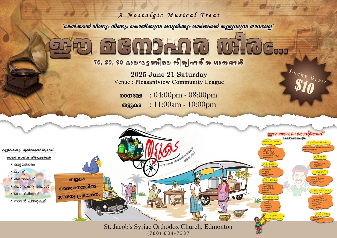 എഡ്മണ്ടൺ: കാനഡയിലെ എഡ്മണ്ടണിലെ സെന്റ് ജേക്കബ് സിറിയൻ ഓർത്തഡോക്സ് ദേവാലയത്തിന്റെ ആഭിമുഖ്യത്തിൽ ജൂൺ 21-ാം തീയതിയായ ശനിയാഴ്ച വൈകിട്ട് 4 മുതൽ രാത്രി 8 വരെ പ്ലസന്റ് വ്യൂ കമ്മ്യൂണിറ്റി ലീഗ് ഹാളിൽ വെച്ച് സംഘടിപ്പിക്കുന്ന കലാസാംസ്കാരിക ആഘോഷം ‘ഈ മനോഹര തീരം...’ എന്ന പേരിൽ സംഘടിപ്പിക്കുന്നു. 1970, 80, 90 കാലഘട്ടങ്ങളിലെ മലയാളം, ഹിന്ദി, തമിഴ് ഭാഷകളിലെ നിത്യഹരിത ഗാനങ്ങൾ സംയോജിപ്പിച്ച സംഗീതവിരുന്നാണ് പ്രധാന ആകർഷണം.
