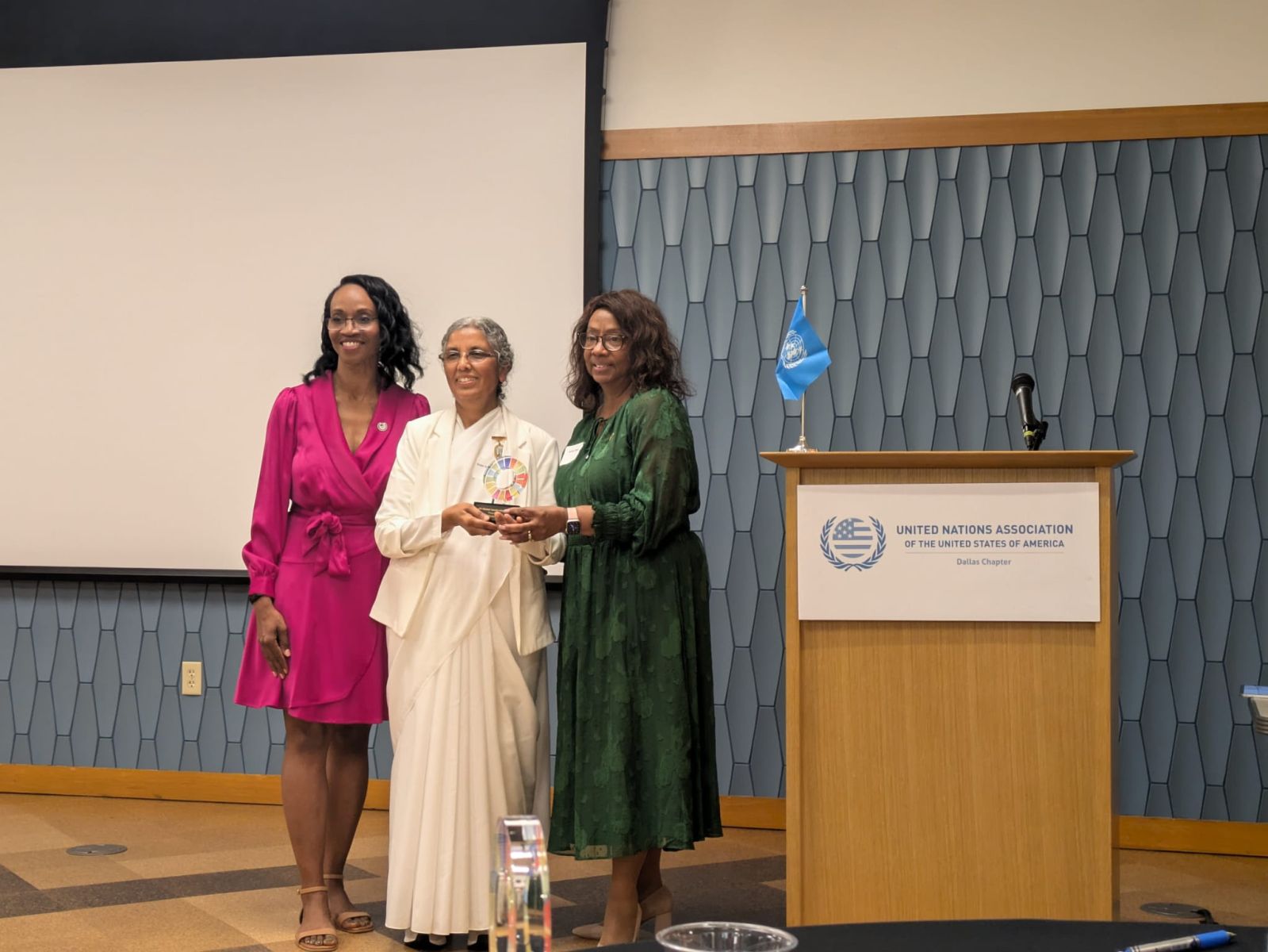 ഡാലസ്: യുണൈറ്റഡ് നേഷൻസ് അസോസിയേഷൻ ഓഫ് യു എസ് എ (യുഎൻഎ-യുഎസ്എ) ഡാളസിൻ്റെ എലീനർ റൂസ്വെൽറ്റ് ലൈഫ് ടൈം അച്ചീവ്മെൻ്റ് അവാർഡ് ബി കെ സിസ്റ്റർ രഞ്ജന് നൽകി ആദരിച്ചു . ഈ അംഗീകാരം ഐക്യരാഷ്ട്രസഭയുടെ സുസ്ഥിര വികസന ലക്ഷ്യങ്ങൾ (എസ്ഡിജി) മുന്നോട്ട് കൊണ്ടുപോകുന്നതിന് സിസ്റ്റർ രഞ്ജൻ്റെ മികച്ച സംഭാവനകളെ ആദരിച്ചാണ്