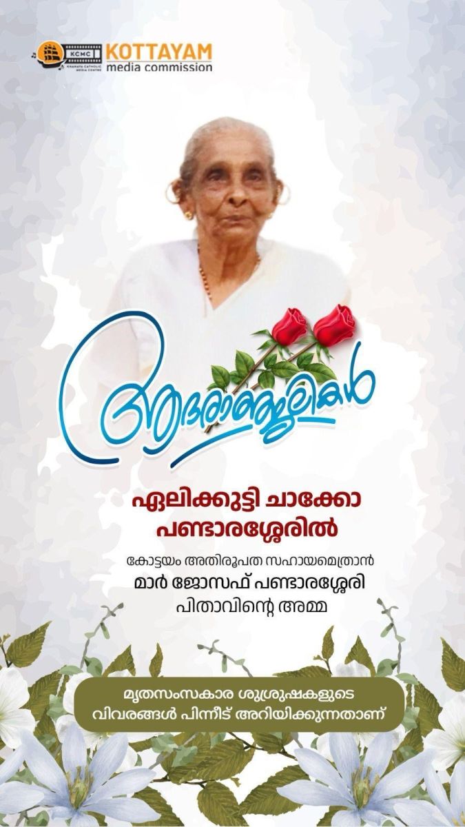 ഏറ്റുമാനൂർ : കോട്ടയം അതിരൂപത സഹായമെത്രാൻ മാർ ജോസഫ് പണ്ടാരശ്ശേരി പിതാവിൻ്റെ അമ്മ എലിക്കുട്ടി ചാക്കോ പണ്ടാരശ്ശേരിൽ (100 ) അന്തരിച്ചു. പരേത കൈപ്പുഴ മൈലാടുംപാറയിൽ കുടുംബാംഗമാണ്.