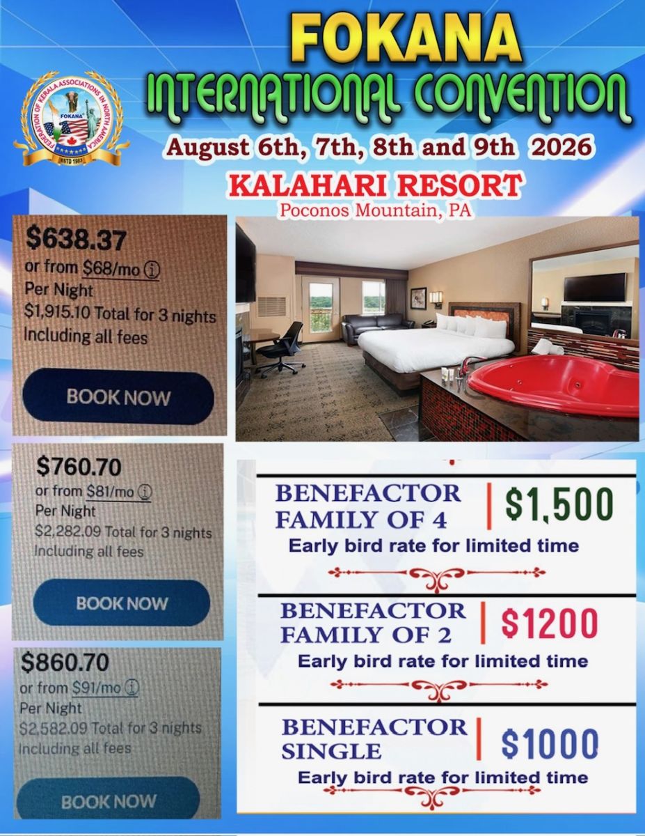 ന്യൂ യോർക്ക് : അമേരിക്കയിലെ മലയാളികളുടെ സംഘടനകളുടെ സംഘടനായ ഫൊക്കാനയുടെ ഇന്റർനാഷണൽ കൺവെൻഷൻ ഓഗസ്റ്റ് 6., 7, 8 , 9 തീയതികളിൽ പെൻസിൽവേനിയയിലെ കൽഹാരി റിസോർട്ടിൽ വെച്ച് ഒരു ചരിത്ര കൺവെൻഷന് സാക്ഷിയാകാൻ പോകുന്നു. നിങ്ങളും അതിൽ ഒരു ഭാഗമാകുവാൻ ഞങ്ങൾ ആഗ്രഹിക്കുന്നതായി പ്രസിഡന്റ് സജിമോൻ ആന്റണി അറിയിച്ചു.