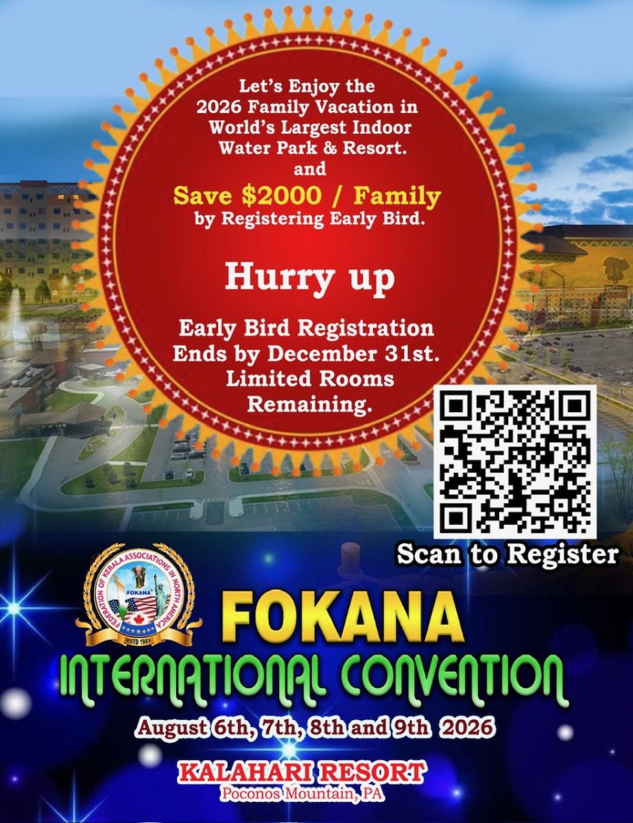 ലോകത്തിലെ ഏറ്റവും വലിയ ഇൻഡോർ ആൻഡ് ഔട്ട് ഡോർ വാട്ടർ പാർക്കാണ് കാലാഹാരി റിസോർട്ട് . പ്രകൃതി ഭംഗികൊണ്ട് അനുഗ്രഹിതമായ പോക്കനോസ് മൗണ്ടൻസിലാണ് ഈ റിസോർട്ട്. അമേരിക്കയുടെ വിവിധ ഭാഗങ്ങളിൽ നിന്നും ഡ്രൈവബിൾ ഡിസ്റ്റൻസ് ആണ് എന്നത് ഏവരെയും പ്രിയങ്കരമാക്കുന്നു. കാലാവസ്ഥയും, രമണീയമായ ഭൂപ്രകൃതിയും , ലോകത്തിലേക്കും ഏറ്റവും വലുതും കുട്ടികൾക്കും വലിയവർക്കും ഒരു പോലെ ആസ്വദിക്കാവുന്ന വാട്ടർ പാർക്കുമാണ് ഏവരെയും പോക്കണോസിനെയും കലാകാരിയെയും വിസ്മയമാക്കുന്നത് . 2026 ലെ ഫാമിലി വെക്കേഷൻ കലഹരിയിൽ ആകട്ടെ ...., ഫൈവ് സ്റ്റാർ റീസർട്ടിലെ താമസം , ഭക്ഷണം , വാട്ടർ പാർക് എൻട്രി ,മാസ്മറിസ് പ്രോഗ്രാംസ് , സ്റ്റേജ് ഷോ . അവാർഡ് നൈറ്റ് , ഗ്രാൻ ഫിനാലെ ഓഫ് യൂവജനോസ്ലാവം തുടഗിയ അനേകം പ്രോഗ്രാമുകൾ ഉൾപ്പെടെ അതിശയിപ്പിക്കുന്ന കലാപരിപാടികൾ ഏവരെയും ഈ കൺവെൻഷൻ സ്വീകാര്യമാക്കുന്നു .