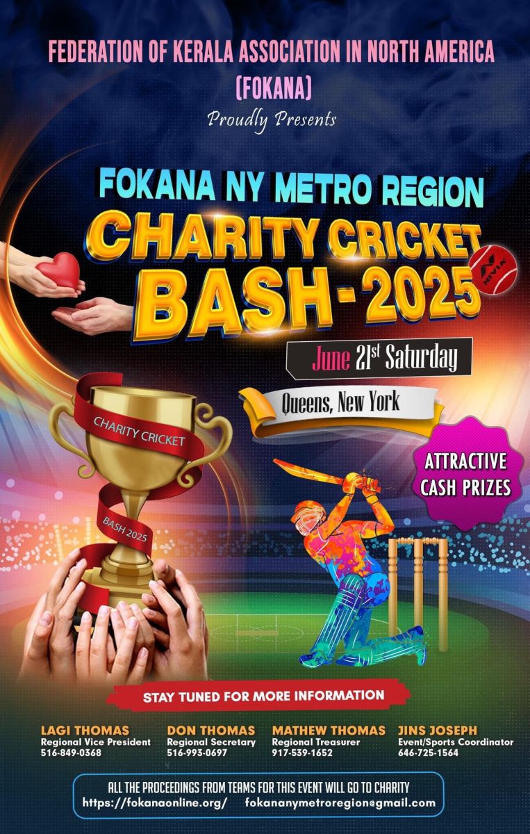 ന്യൂ യോര്ക്ക് : ഫൊക്കാന ന്യൂ യോര്ക്ക് മെട്രോ റീജിയൻ പ്രഥമ ചാരിറ്റി ക്രിക്കറ്റ് ബാഷ് 2025 ടൂർണമെന്റ് ജൂൺ 21 ശനിയാഴ്ച സംഘടിപ്പിച്ചിരിക്കുന്നു . ടൂര്ണമെന്റിനായുള്ള ഒരുക്കങ്ങൾ പുരോഗമിക്കുന്നതായി ഭാരവാഹികൾ അറിയിച്ചു. ടൂർണമെന്റിന്റെ ഒഫീഷ്യൽ ഫ്ലയർ ഫൊക്കാന ന്യൂയോർക് മെട്രോ റീജിയൻ പ്രവർത്തന ഉൽഘാടന ചടങ്ങിൽ ഫൊക്കാന പ്രസിഡന്റ് സജിമോൻ ആന്റണി പ്രകാശനം ചെയ്തു . ഫൊക്കാനയുടെ മുതിർന്ന നേതാവും ബോർഡ് മെമ്പറുമായ തോമസ് തോമസ് ടൂര്ണമെന്റിനുള്ള എല്ലാ ട്രോഫികളും വാഗ്ദാനം ചെയ്തു .റീജിയണൽ വൈസ് പ്രസിഡന്റ് ലാജി തോമസ്, ,റീജിയണൽ സെക്രട്ടറി ഡോൺ തോമസ്, റീജിയണൽ ട്രഷറർ മാത്യു തോമസ്, ടൂർണമെന്റ് കോഓർഡിനേറ്റർ ജിൻസ് ജോസഫ്, ടൂർണമെന്റ് പിആർഓ ജോയൽ സ്കറിയ എന്നിവർ ചടങ്ങിൽ സന്നിഹിതരായിരുന്നു.
