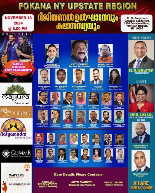 ന്യൂ യോർക്ക്: നോര്ത്ത് അമേരിക്കയിലെ മലയാളി സംഘടനകളുടെ സംഘടനയായ ഫൊക്കാനയുടെ പ്രബല റീജിയനുകളിൽ ഒന്നായ ന്യൂ യോർക്ക് അപ്പ്സ്റ്റേറ്റ് റീജിയന്റെ (റീജിയൻ 3 ) പ്രവർത്തന ഉത്ഘാടനവും കലാമേളയും 2024 നവംബർ 16 ആം തീയതി ശനിയാഴ്ച വൈകുന്നേരം 5 മണി മുതൽ യോർക്ക് ടൗൺ ഹൈറ്സിലുള്ള സെന്റ് ഗിഗോറിയസ് ഓർത്തഡോക്സ് ഓഡിറ്റോറിയത്തിൽ (2966 Crompond Road, Yorktown Heights ,NY 10598 )വെച്ച് വിപുലമായ പരിപാടികളോട് നടത്തുന്നതാണ് എന്ന് റീജണൽ വൈസ് പ്രസിഡന്റ് ആന്റോ വർക്കി അറിയിച്ചു.